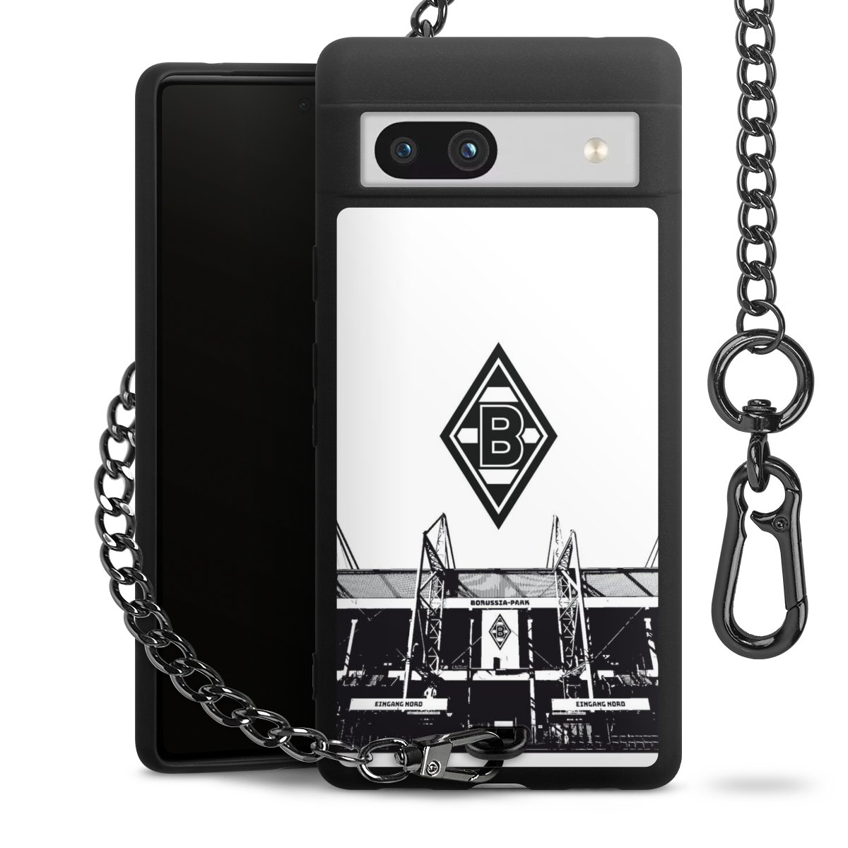 Die mattschwarze Silikon-Handyhülle besteht aus robustem TPU (thermoplastisches Polyurethan). Sie ist flexibel und schützt Dein Smartphone vor Stößen und Kratzern. Die Kette sowie der Karabinerhaken sind aus Metall in Gunmetal-Optik gefertigt. Für dieses Produkt kommen ausschließlich TÜV-geprüfte Materialien zum Einsatz.
