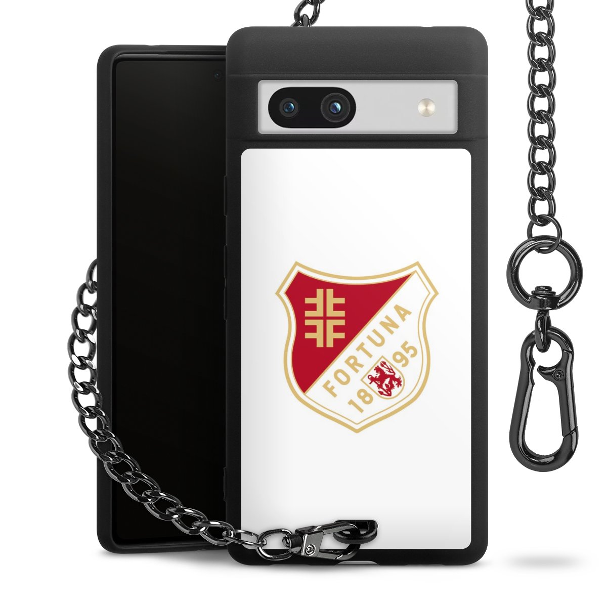Die mattschwarze Silikon-Handyhülle besteht aus robustem TPU (thermoplastisches Polyurethan). Sie ist flexibel und schützt Dein Smartphone vor Stößen und Kratzern. Die Kette sowie der Karabinerhaken sind aus Metall in Gunmetal-Optik gefertigt. Für dieses Produkt kommen ausschließlich TÜV-geprüfte Materialien zum Einsatz.