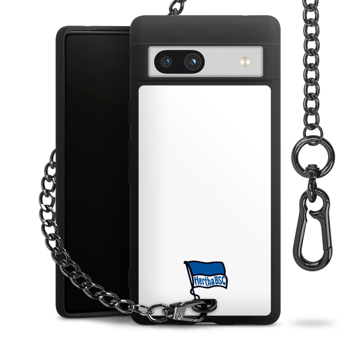 Die mattschwarze Silikon-Handyhülle besteht aus robustem TPU (thermoplastisches Polyurethan). Sie ist flexibel und schützt Dein Smartphone vor Stößen und Kratzern. Die Kette sowie der Karabinerhaken sind aus Metall in Gunmetal-Optik gefertigt. Für dieses Produkt kommen ausschließlich TÜV-geprüfte Materialien zum Einsatz.