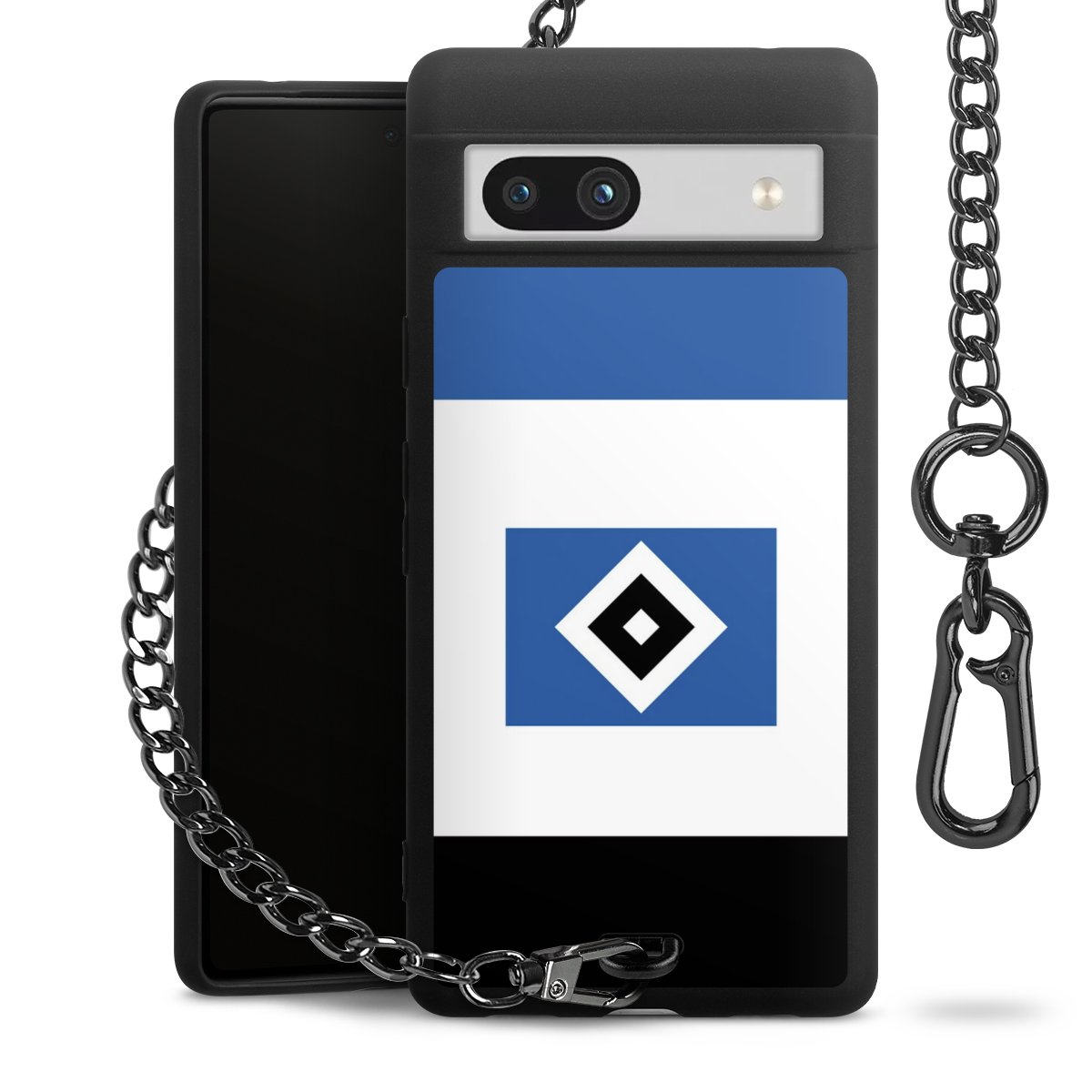 Die mattschwarze Silikon-Handyhülle besteht aus robustem TPU (thermoplastisches Polyurethan). Sie ist flexibel und schützt Dein Smartphone vor Stößen und Kratzern. Die Kette sowie der Karabinerhaken sind aus Metall in Gunmetal-Optik gefertigt. Für dieses Produkt kommen ausschließlich TÜV-geprüfte Materialien zum Einsatz.