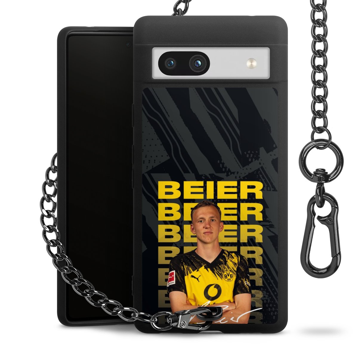 Die mattschwarze Silikon-Handyhülle besteht aus robustem TPU (thermoplastisches Polyurethan). Sie ist flexibel und schützt Dein Smartphone vor Stößen und Kratzern. Die Kette sowie der Karabinerhaken sind aus Metall in Gunmetal-Optik gefertigt. Für dieses Produkt kommen ausschließlich TÜV-geprüfte Materialien zum Einsatz.