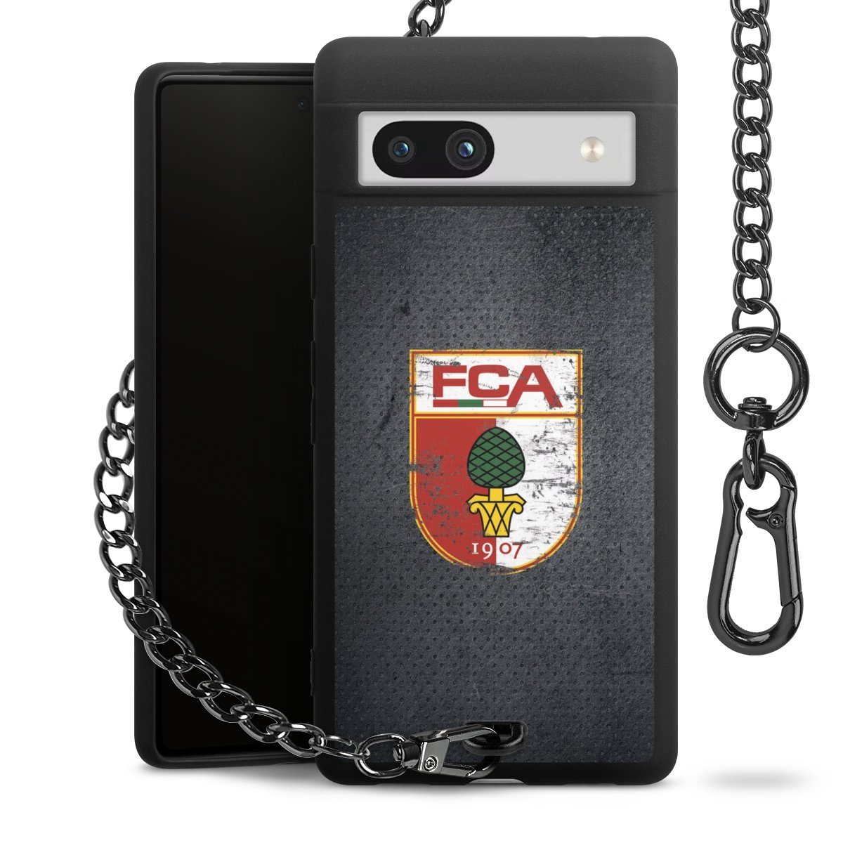Die mattschwarze Silikon-Handyhülle besteht aus robustem TPU (thermoplastisches Polyurethan). Sie ist flexibel und schützt Dein Smartphone vor Stößen und Kratzern. Die Kette sowie der Karabinerhaken sind aus Metall in Gunmetal-Optik gefertigt. Für dieses Produkt kommen ausschließlich TÜV-geprüfte Materialien zum Einsatz.
