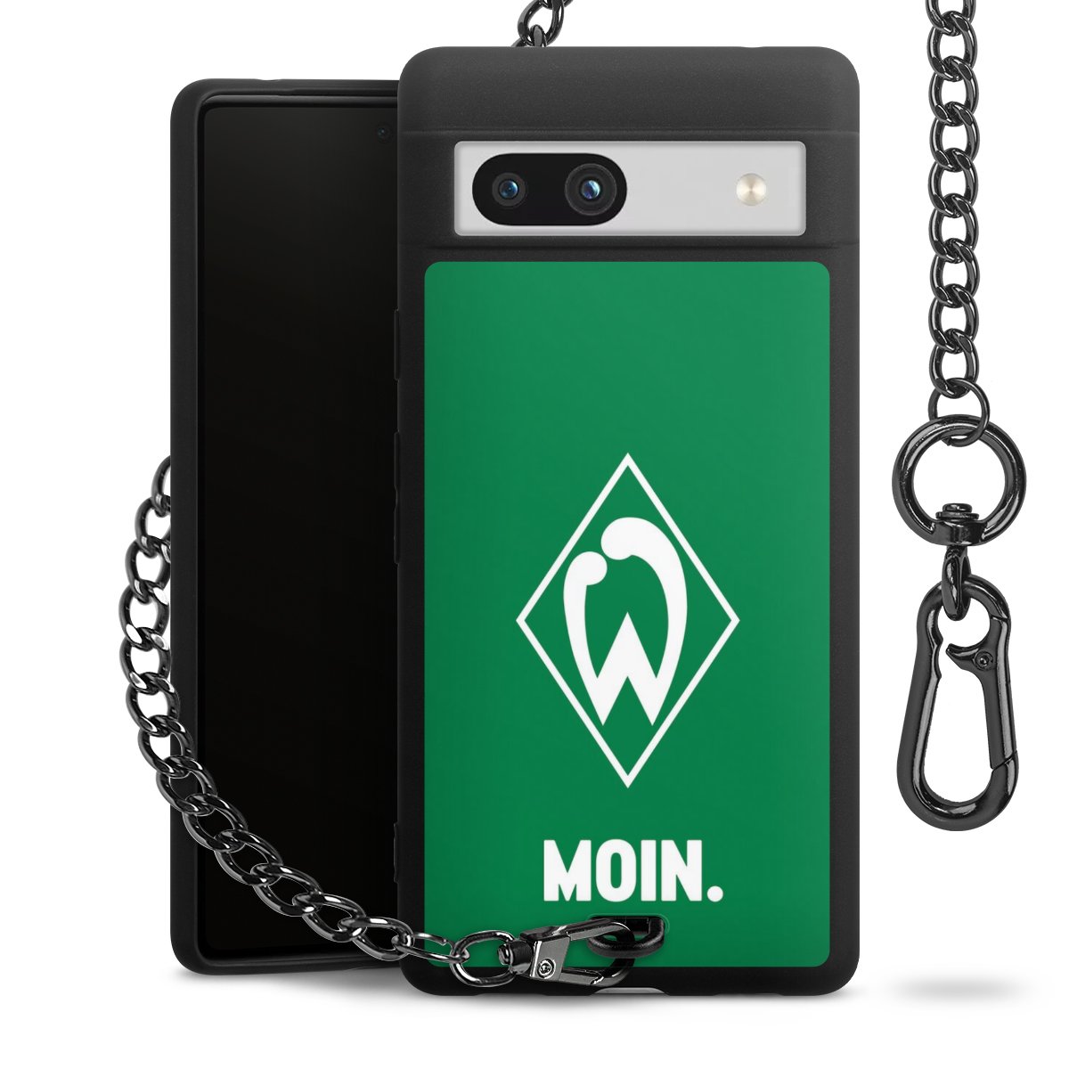 Die mattschwarze Silikon-Handyhülle besteht aus robustem TPU (thermoplastisches Polyurethan). Sie ist flexibel und schützt Dein Smartphone vor Stößen und Kratzern. Die Kette sowie der Karabinerhaken sind aus Metall in Gunmetal-Optik gefertigt. Für dieses Produkt kommen ausschließlich TÜV-geprüfte Materialien zum Einsatz.