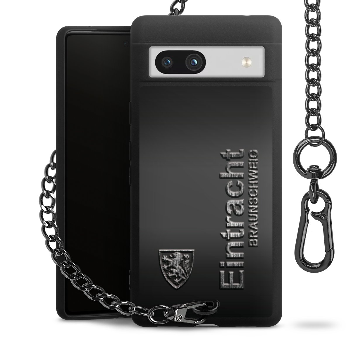 Die mattschwarze Silikon-Handyhülle besteht aus robustem TPU (thermoplastisches Polyurethan). Sie ist flexibel und schützt Dein Smartphone vor Stößen und Kratzern. Die Kette sowie der Karabinerhaken sind aus Metall in Gunmetal-Optik gefertigt. Für dieses Produkt kommen ausschließlich TÜV-geprüfte Materialien zum Einsatz.