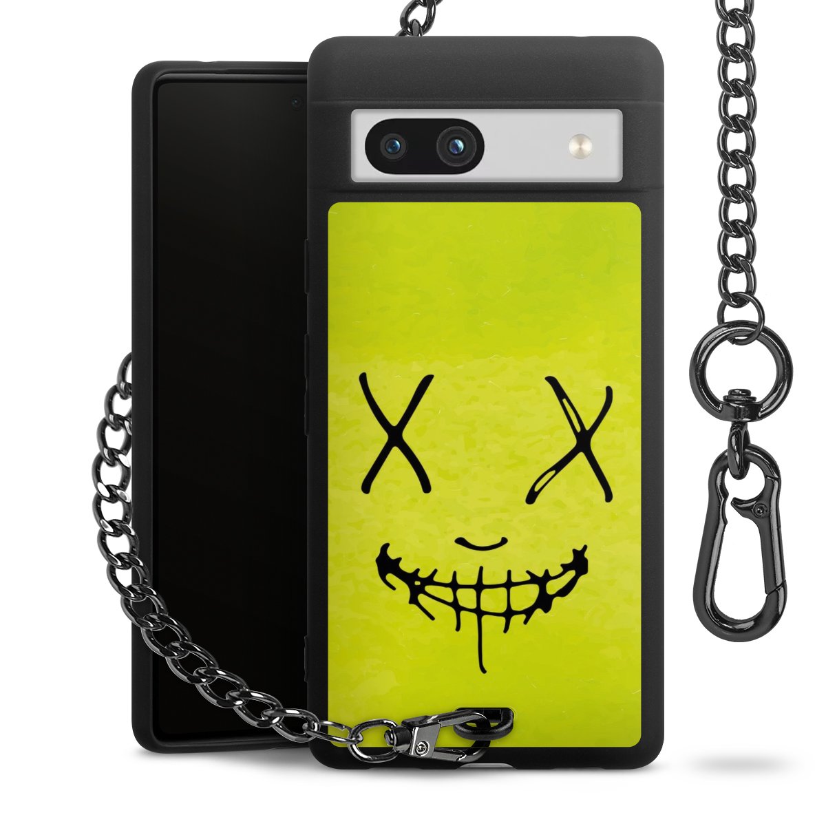 Die mattschwarze Silikon-Handyhülle besteht aus robustem TPU (thermoplastisches Polyurethan). Sie ist flexibel und schützt Dein Smartphone vor Stößen und Kratzern. Die Kette sowie der Karabinerhaken sind aus Metall in Gunmetal-Optik gefertigt. Für dieses Produkt kommen ausschließlich TÜV-geprüfte Materialien zum Einsatz.