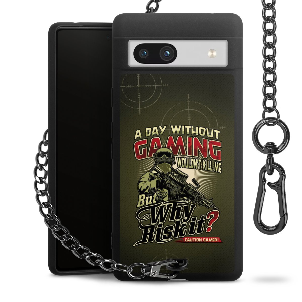 Die mattschwarze Silikon-Handyhülle besteht aus robustem TPU (thermoplastisches Polyurethan). Sie ist flexibel und schützt Dein Smartphone vor Stößen und Kratzern. Die Kette sowie der Karabinerhaken sind aus Metall in Gunmetal-Optik gefertigt. Für dieses Produkt kommen ausschließlich TÜV-geprüfte Materialien zum Einsatz.