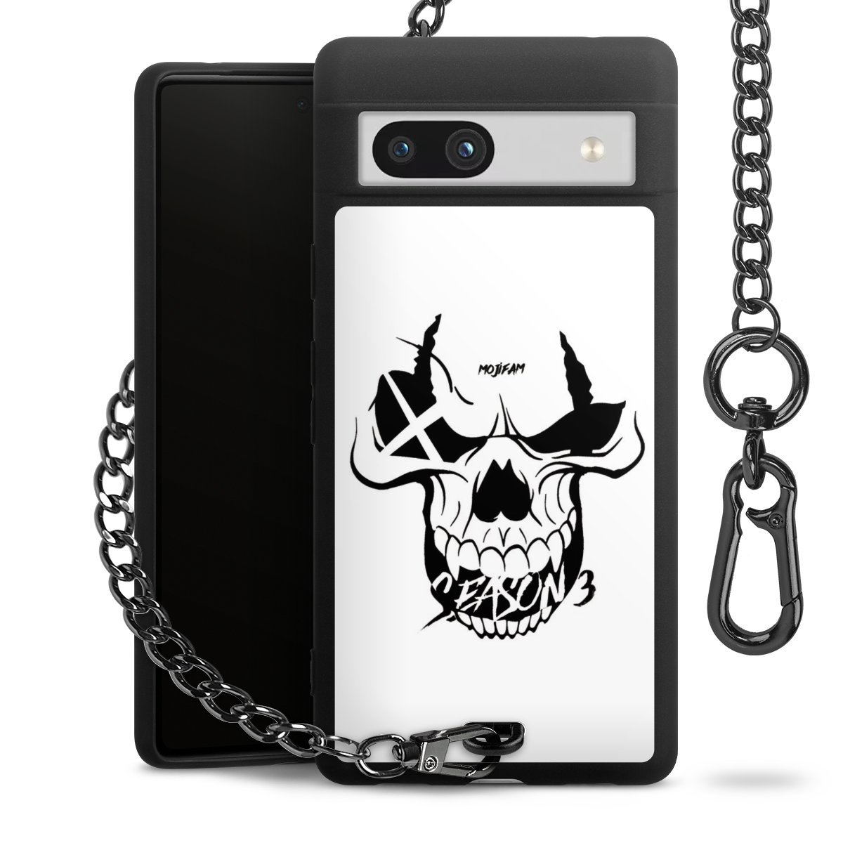 Die mattschwarze Silikon-Handyhülle besteht aus robustem TPU (thermoplastisches Polyurethan). Sie ist flexibel und schützt Dein Smartphone vor Stößen und Kratzern. Die Kette sowie der Karabinerhaken sind aus Metall in Gunmetal-Optik gefertigt. Für dieses Produkt kommen ausschließlich TÜV-geprüfte Materialien zum Einsatz.