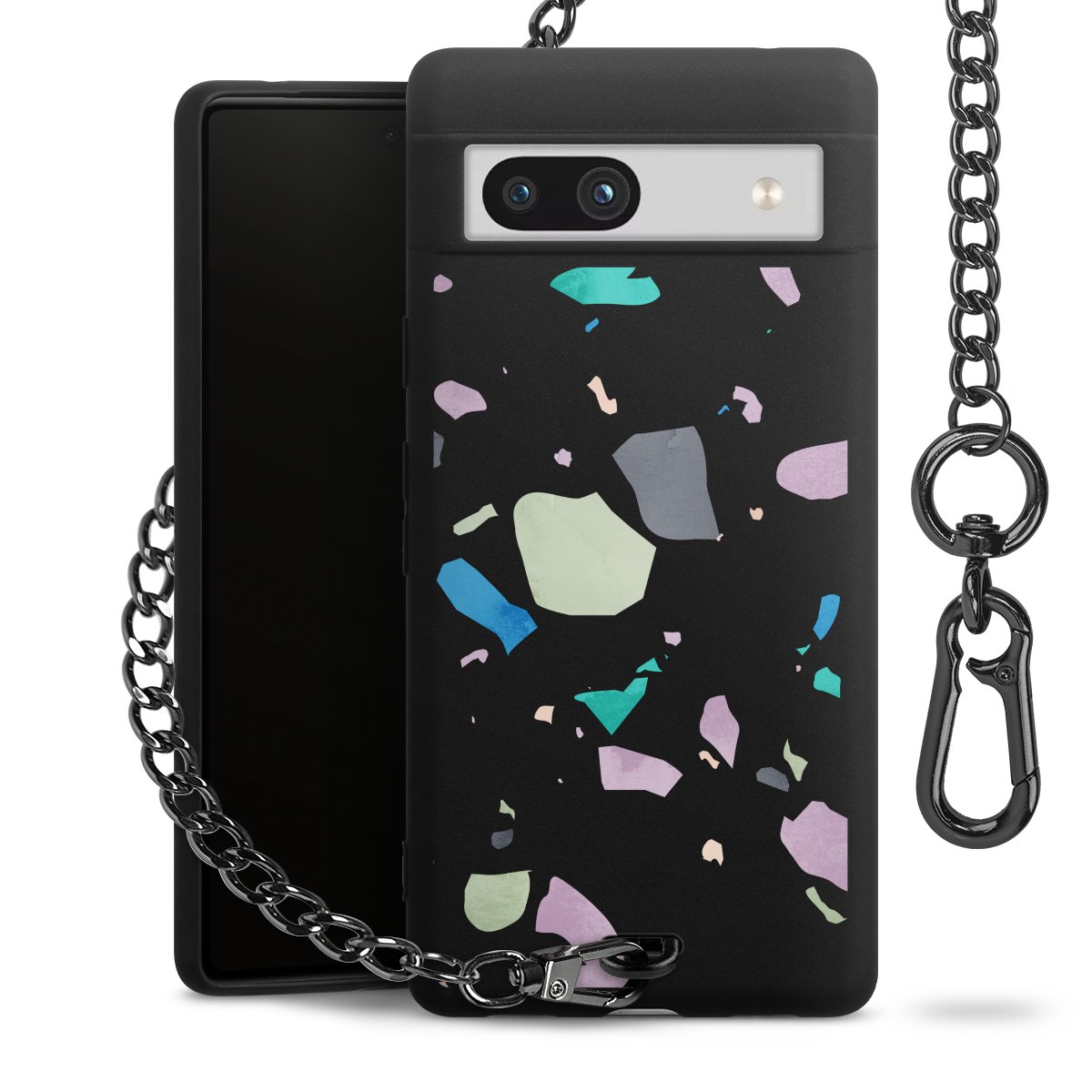 Die mattschwarze Silikon-Handyhülle besteht aus robustem TPU (thermoplastisches Polyurethan). Sie ist flexibel und schützt Dein Smartphone vor Stößen und Kratzern. Die Kette sowie der Karabinerhaken sind aus Metall in Gunmetal-Optik gefertigt. Für dieses Produkt kommen ausschließlich TÜV-geprüfte Materialien zum Einsatz.