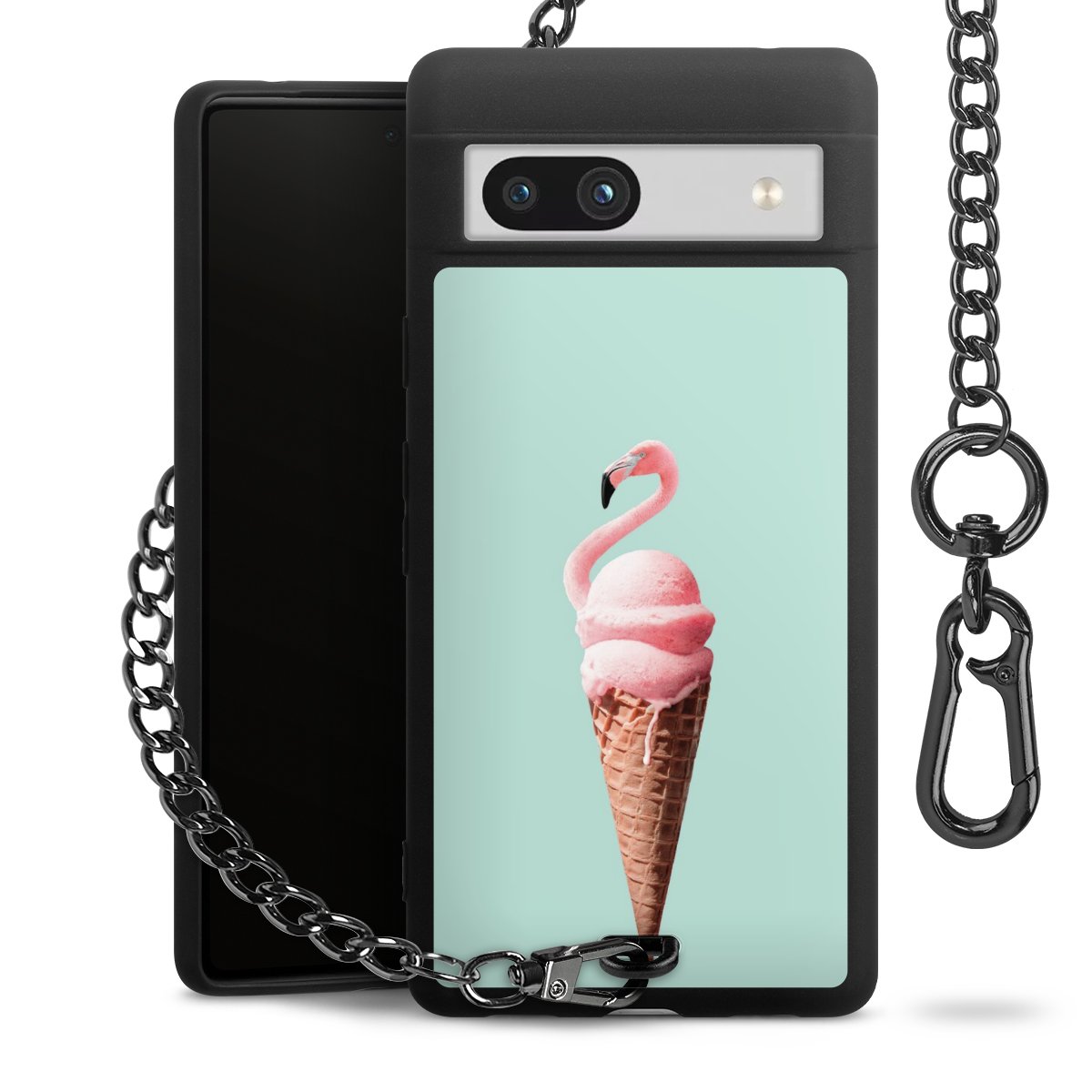 Die mattschwarze Silikon-Handyhülle besteht aus robustem TPU (thermoplastisches Polyurethan). Sie ist flexibel und schützt Dein Smartphone vor Stößen und Kratzern. Die Kette sowie der Karabinerhaken sind aus Metall in Gunmetal-Optik gefertigt. Für dieses Produkt kommen ausschließlich TÜV-geprüfte Materialien zum Einsatz.