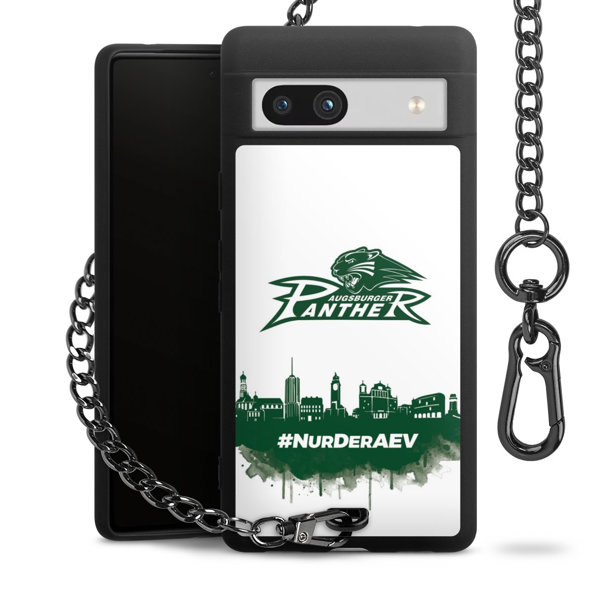 Die mattschwarze Silikon-Handyhülle besteht aus robustem TPU (thermoplastisches Polyurethan). Sie ist flexibel und schützt Dein Smartphone vor Stößen und Kratzern. Die Kette sowie der Karabinerhaken sind aus Metall in Gunmetal-Optik gefertigt. Für dieses Produkt kommen ausschließlich TÜV-geprüfte Materialien zum Einsatz.