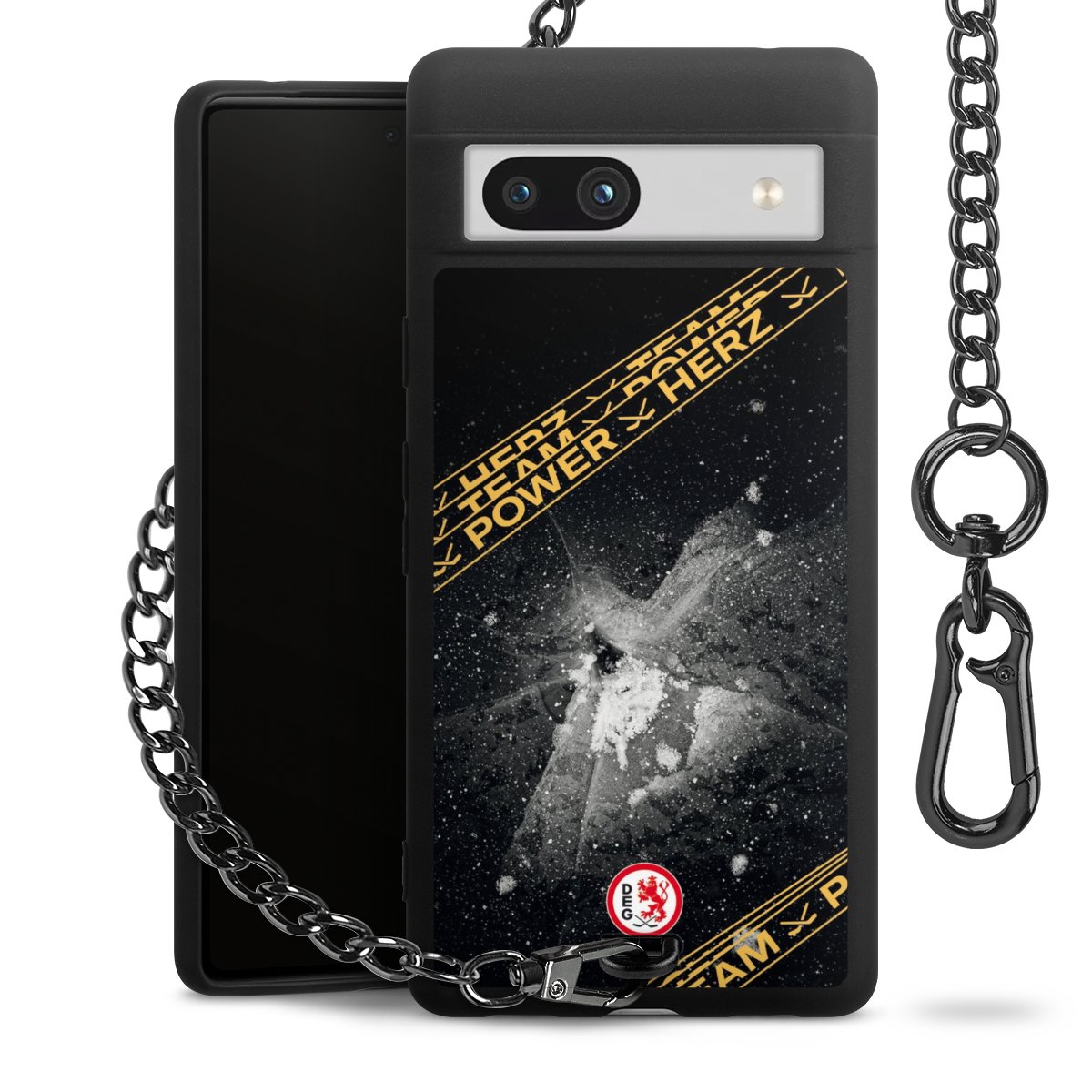 Die mattschwarze Silikon-Handyhülle besteht aus robustem TPU (thermoplastisches Polyurethan). Sie ist flexibel und schützt Dein Smartphone vor Stößen und Kratzern. Die Kette sowie der Karabinerhaken sind aus Metall in Gunmetal-Optik gefertigt. Für dieses Produkt kommen ausschließlich TÜV-geprüfte Materialien zum Einsatz.