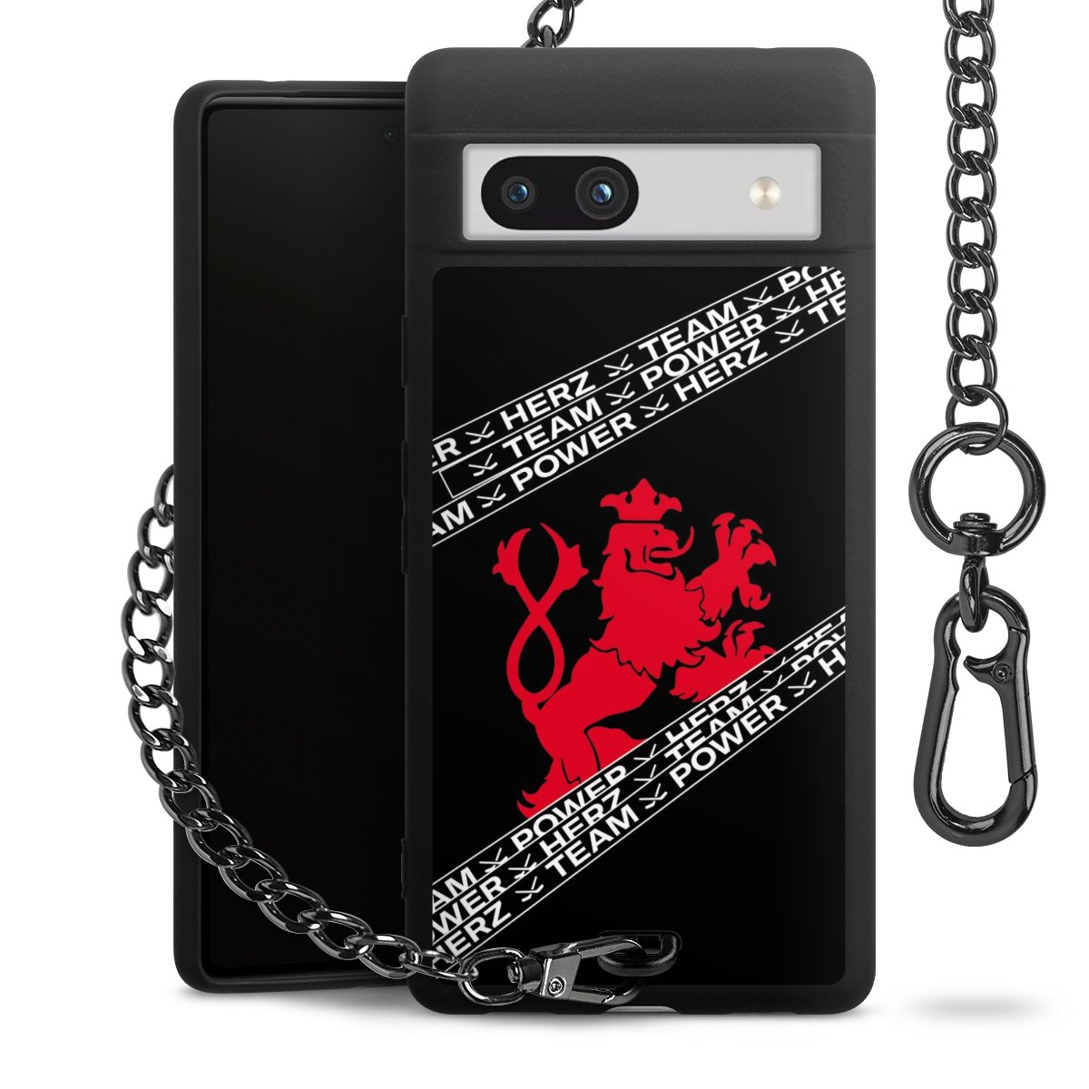 Die mattschwarze Silikon-Handyhülle besteht aus robustem TPU (thermoplastisches Polyurethan). Sie ist flexibel und schützt Dein Smartphone vor Stößen und Kratzern. Die Kette sowie der Karabinerhaken sind aus Metall in Gunmetal-Optik gefertigt. Für dieses Produkt kommen ausschließlich TÜV-geprüfte Materialien zum Einsatz.
