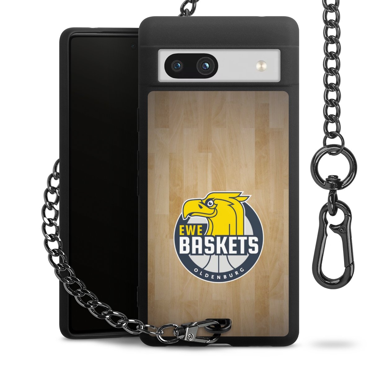 Die mattschwarze Silikon-Handyhülle besteht aus robustem TPU (thermoplastisches Polyurethan). Sie ist flexibel und schützt Dein Smartphone vor Stößen und Kratzern. Die Kette sowie der Karabinerhaken sind aus Metall in Gunmetal-Optik gefertigt. Für dieses Produkt kommen ausschließlich TÜV-geprüfte Materialien zum Einsatz.
