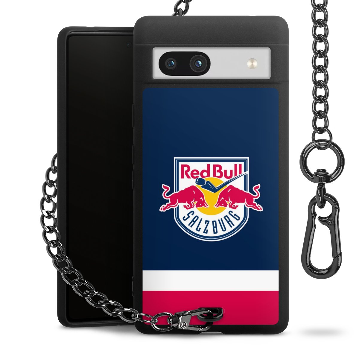 Die mattschwarze Silikon-Handyhülle besteht aus robustem TPU (thermoplastisches Polyurethan). Sie ist flexibel und schützt Dein Smartphone vor Stößen und Kratzern. Die Kette sowie der Karabinerhaken sind aus Metall in Gunmetal-Optik gefertigt. Für dieses Produkt kommen ausschließlich TÜV-geprüfte Materialien zum Einsatz.