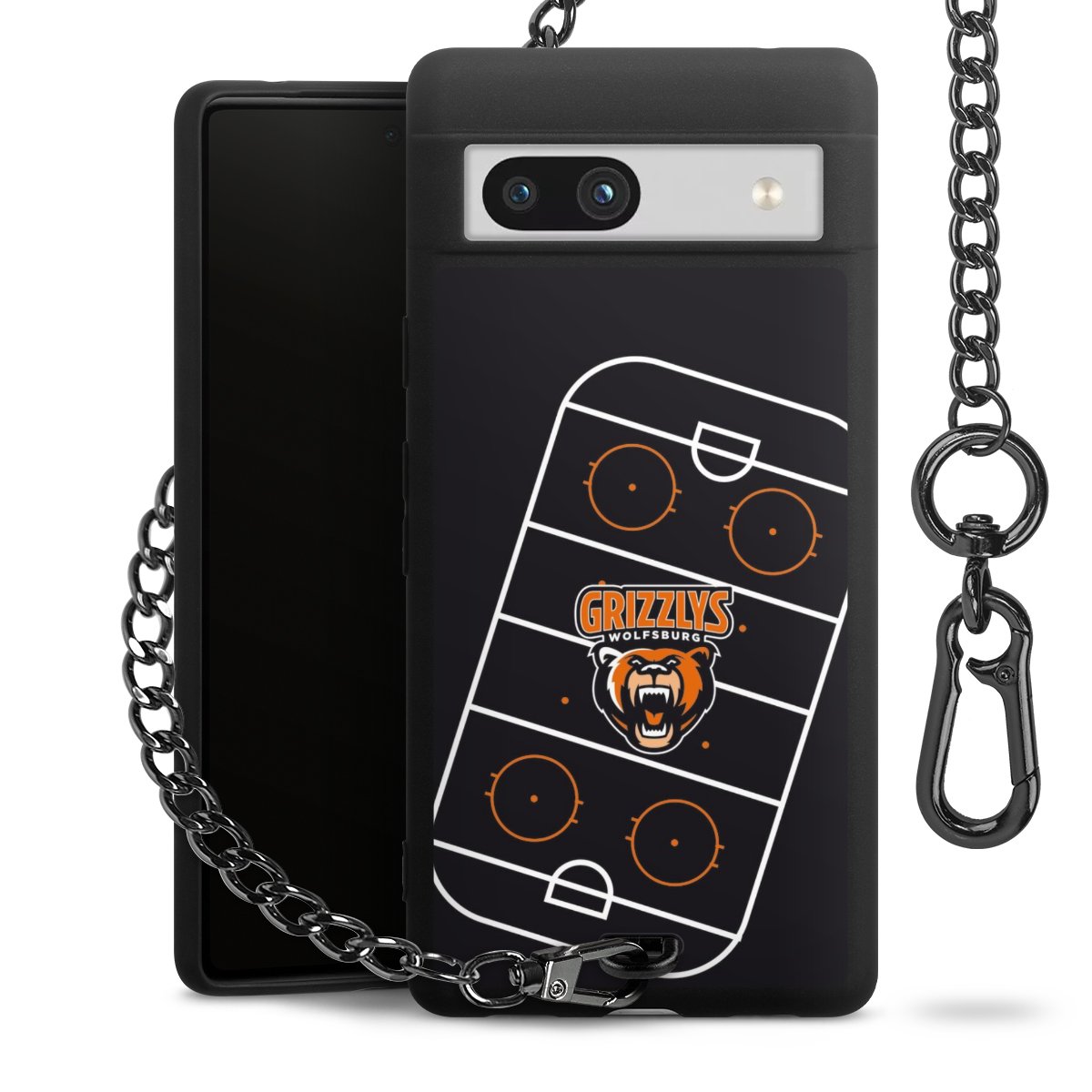 Die mattschwarze Silikon-Handyhülle besteht aus robustem TPU (thermoplastisches Polyurethan). Sie ist flexibel und schützt Dein Smartphone vor Stößen und Kratzern. Die Kette sowie der Karabinerhaken sind aus Metall in Gunmetal-Optik gefertigt. Für dieses Produkt kommen ausschließlich TÜV-geprüfte Materialien zum Einsatz.