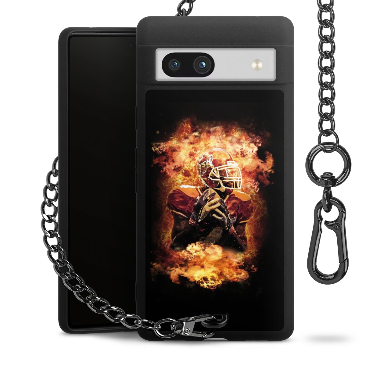 Die mattschwarze Silikon-Handyhülle besteht aus robustem TPU (thermoplastisches Polyurethan). Sie ist flexibel und schützt Dein Smartphone vor Stößen und Kratzern. Die Kette sowie der Karabinerhaken sind aus Metall in Gunmetal-Optik gefertigt. Für dieses Produkt kommen ausschließlich TÜV-geprüfte Materialien zum Einsatz.