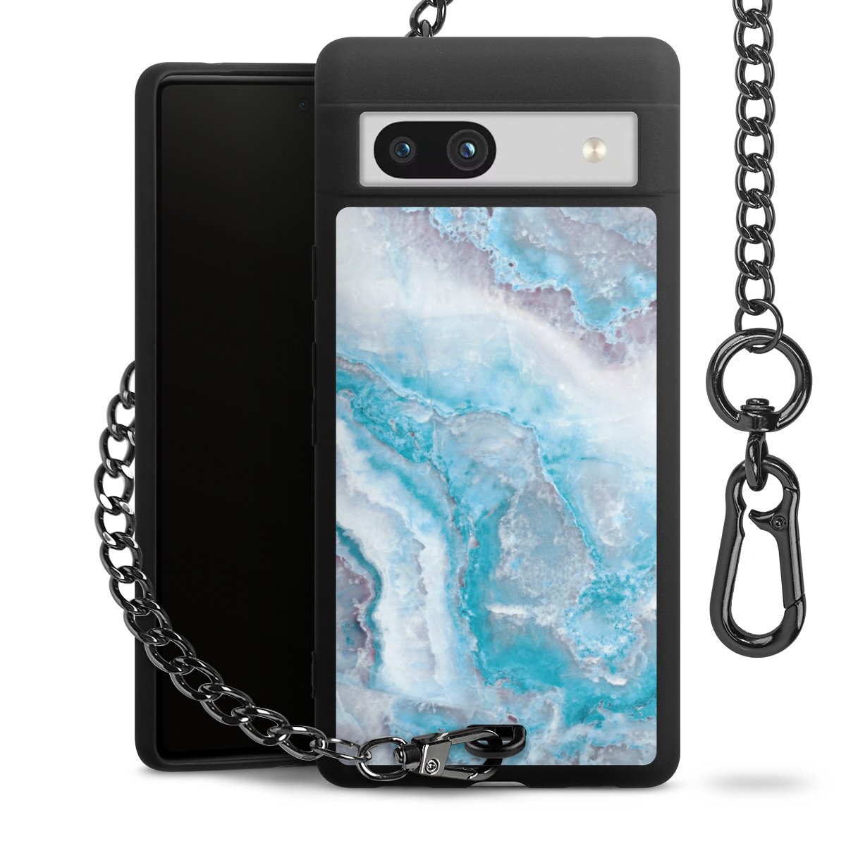 Die mattschwarze Silikon-Handyhülle besteht aus robustem TPU (thermoplastisches Polyurethan). Sie ist flexibel und schützt Dein Smartphone vor Stößen und Kratzern. Die Kette sowie der Karabinerhaken sind aus Metall in Gunmetal-Optik gefertigt. Für dieses Produkt kommen ausschließlich TÜV-geprüfte Materialien zum Einsatz.