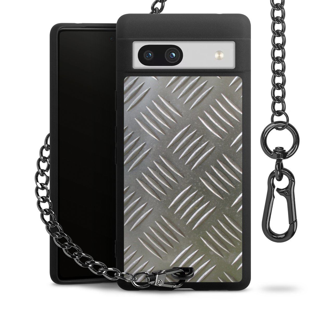 Die mattschwarze Silikon-Handyhülle besteht aus robustem TPU (thermoplastisches Polyurethan). Sie ist flexibel und schützt Dein Smartphone vor Stößen und Kratzern. Die Kette sowie der Karabinerhaken sind aus Metall in Gunmetal-Optik gefertigt. Für dieses Produkt kommen ausschließlich TÜV-geprüfte Materialien zum Einsatz.
