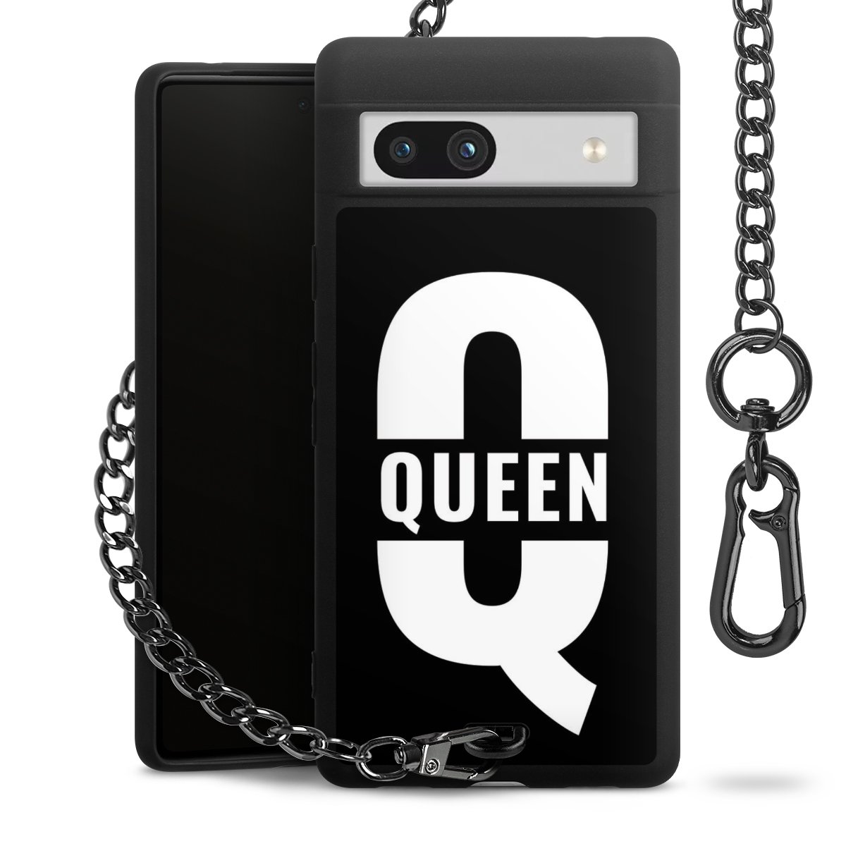 Die mattschwarze Silikon-Handyhülle besteht aus robustem TPU (thermoplastisches Polyurethan). Sie ist flexibel und schützt Dein Smartphone vor Stößen und Kratzern. Die Kette sowie der Karabinerhaken sind aus Metall in Gunmetal-Optik gefertigt. Für dieses Produkt kommen ausschließlich TÜV-geprüfte Materialien zum Einsatz.