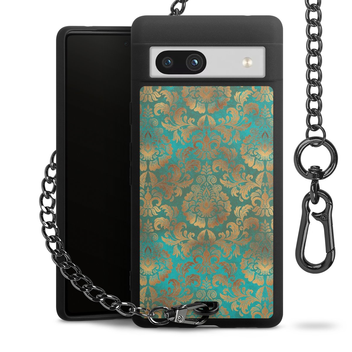 Die mattschwarze Silikon-Handyhülle besteht aus robustem TPU (thermoplastisches Polyurethan). Sie ist flexibel und schützt Dein Smartphone vor Stößen und Kratzern. Die Kette sowie der Karabinerhaken sind aus Metall in Gunmetal-Optik gefertigt. Für dieses Produkt kommen ausschließlich TÜV-geprüfte Materialien zum Einsatz.