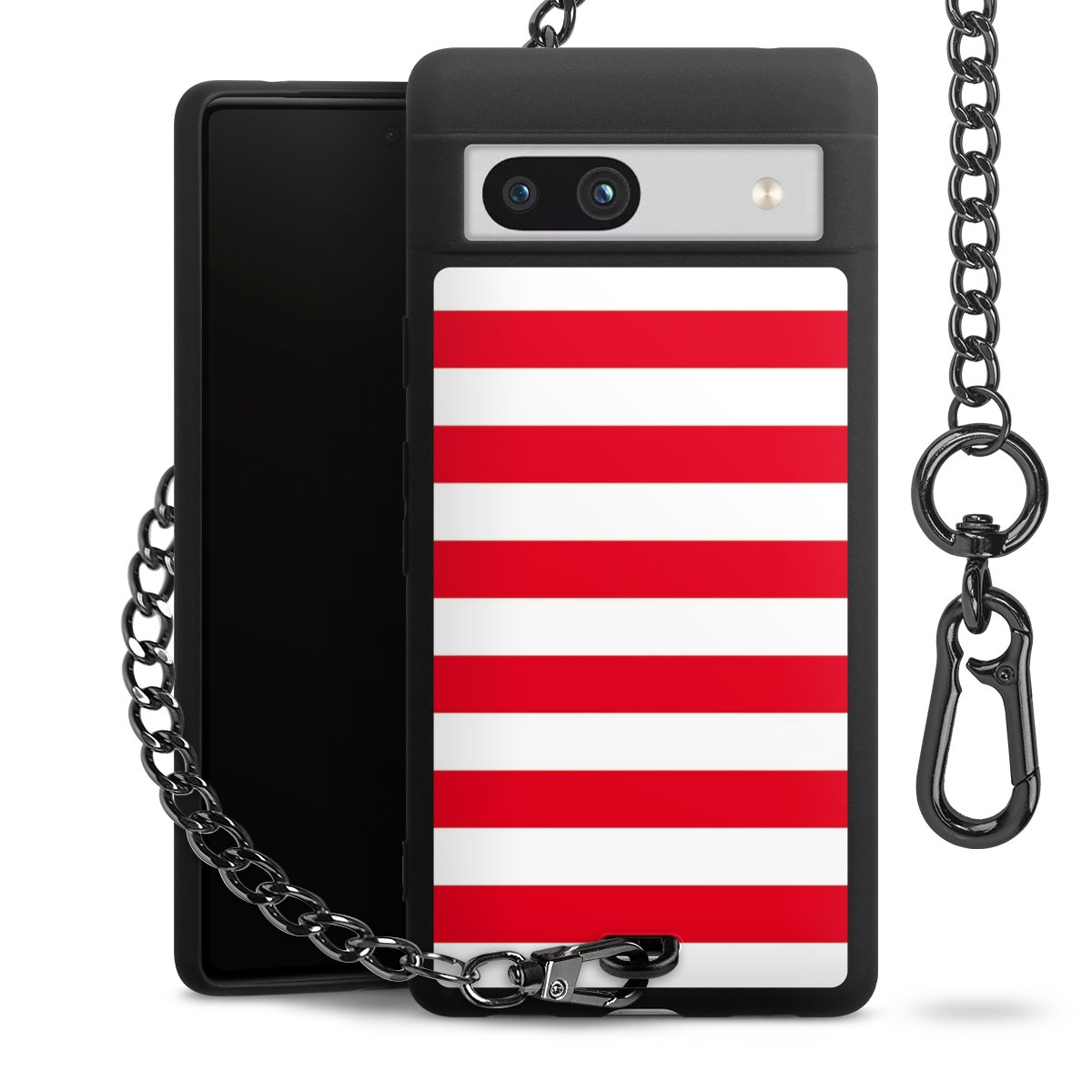 Die mattschwarze Silikon-Handyhülle besteht aus robustem TPU (thermoplastisches Polyurethan). Sie ist flexibel und schützt Dein Smartphone vor Stößen und Kratzern. Die Kette sowie der Karabinerhaken sind aus Metall in Gunmetal-Optik gefertigt. Für dieses Produkt kommen ausschließlich TÜV-geprüfte Materialien zum Einsatz.