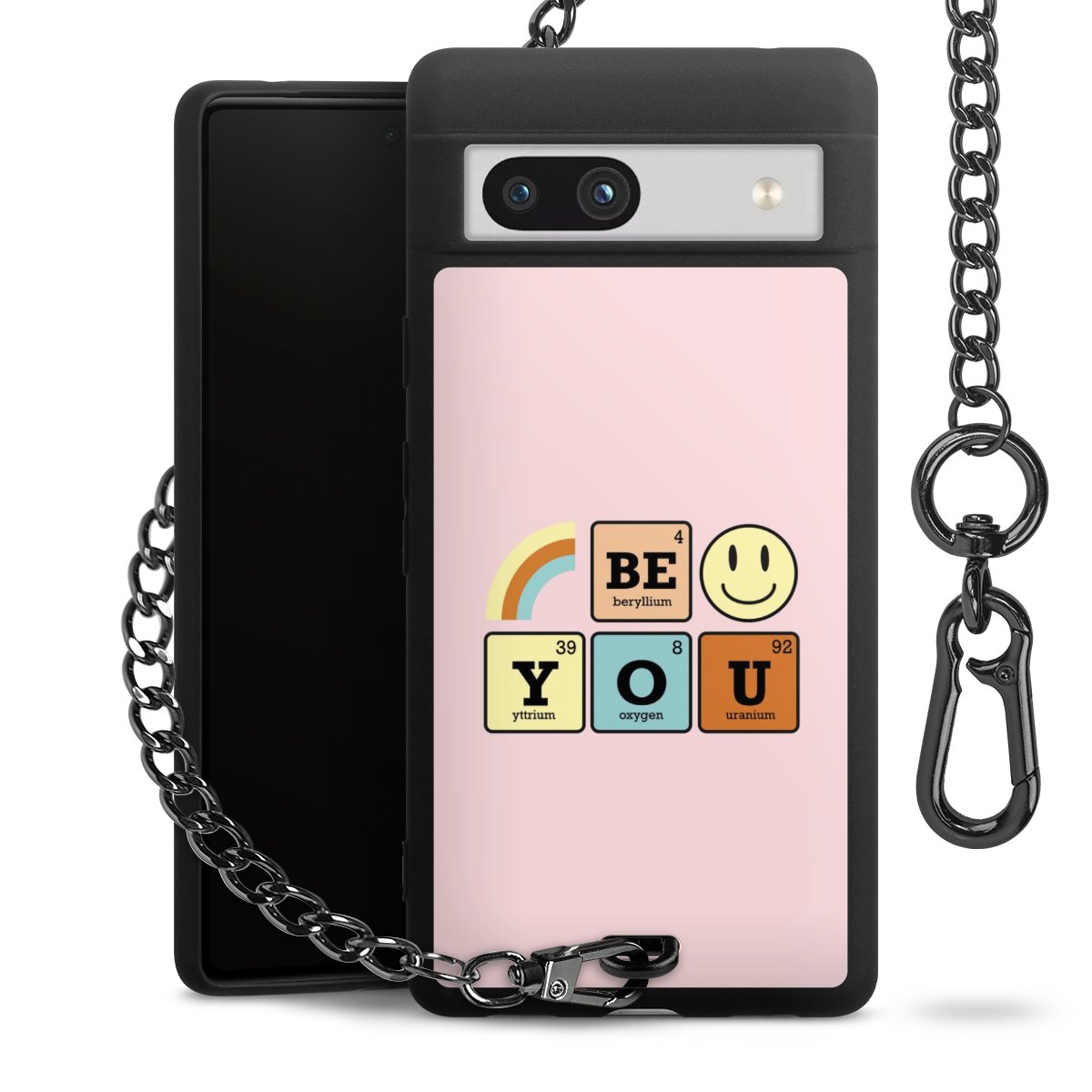 Die mattschwarze Silikon-Handyhülle besteht aus robustem TPU (thermoplastisches Polyurethan). Sie ist flexibel und schützt Dein Smartphone vor Stößen und Kratzern. Die Kette sowie der Karabinerhaken sind aus Metall in Gunmetal-Optik gefertigt. Für dieses Produkt kommen ausschließlich TÜV-geprüfte Materialien zum Einsatz.