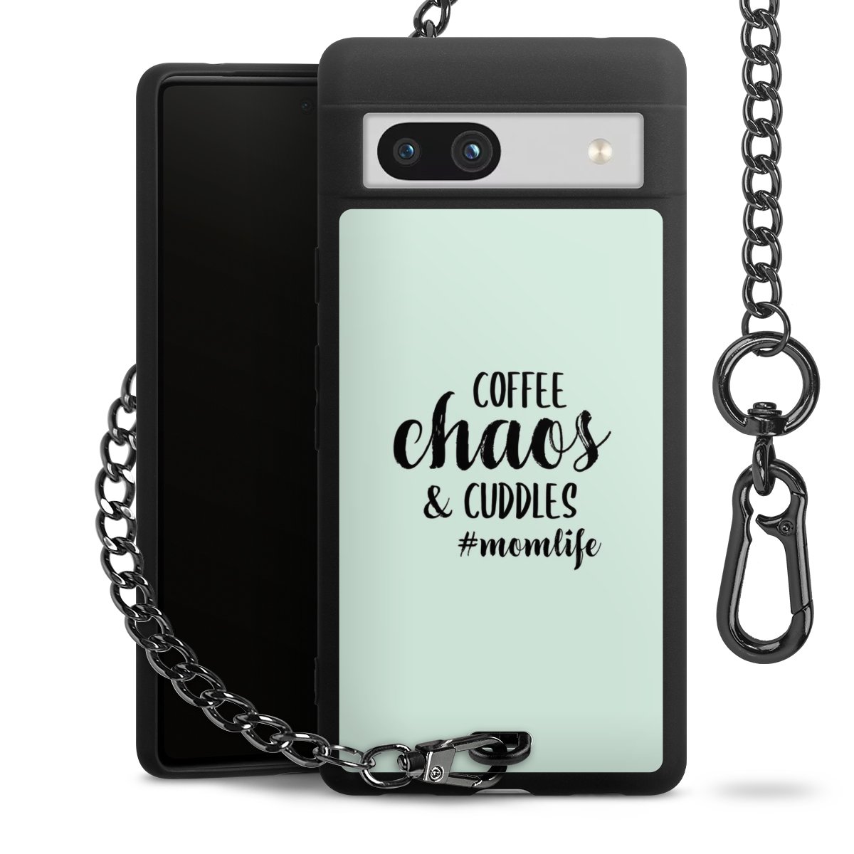 Die mattschwarze Silikon-Handyhülle besteht aus robustem TPU (thermoplastisches Polyurethan). Sie ist flexibel und schützt Dein Smartphone vor Stößen und Kratzern. Die Kette sowie der Karabinerhaken sind aus Metall in Gunmetal-Optik gefertigt. Für dieses Produkt kommen ausschließlich TÜV-geprüfte Materialien zum Einsatz.