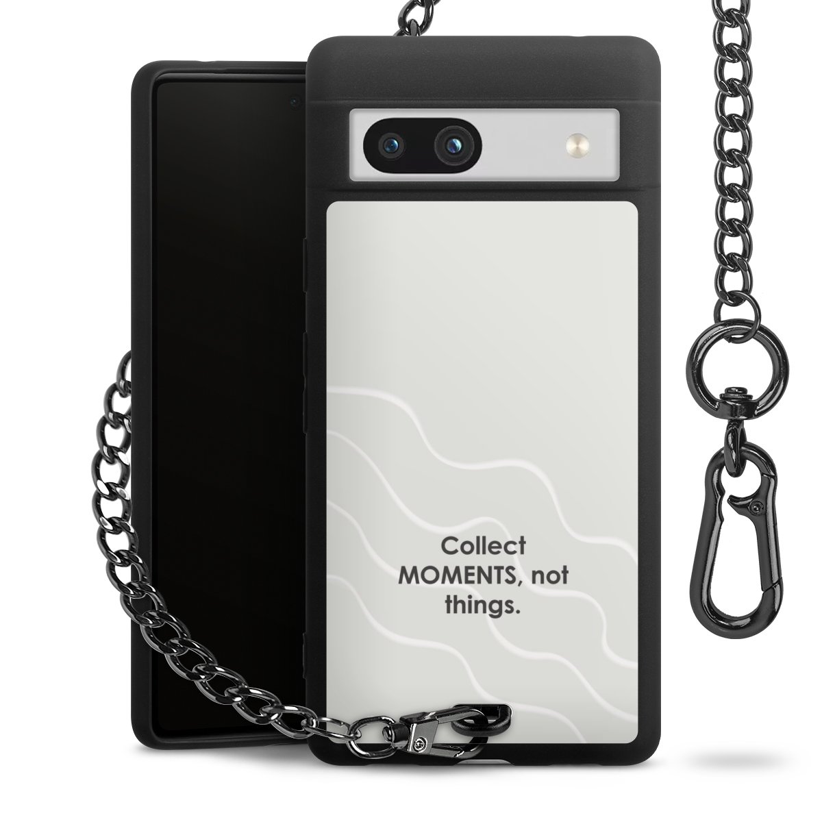 Die mattschwarze Silikon-Handyhülle besteht aus robustem TPU (thermoplastisches Polyurethan). Sie ist flexibel und schützt Dein Smartphone vor Stößen und Kratzern. Die Kette sowie der Karabinerhaken sind aus Metall in Gunmetal-Optik gefertigt. Für dieses Produkt kommen ausschließlich TÜV-geprüfte Materialien zum Einsatz.