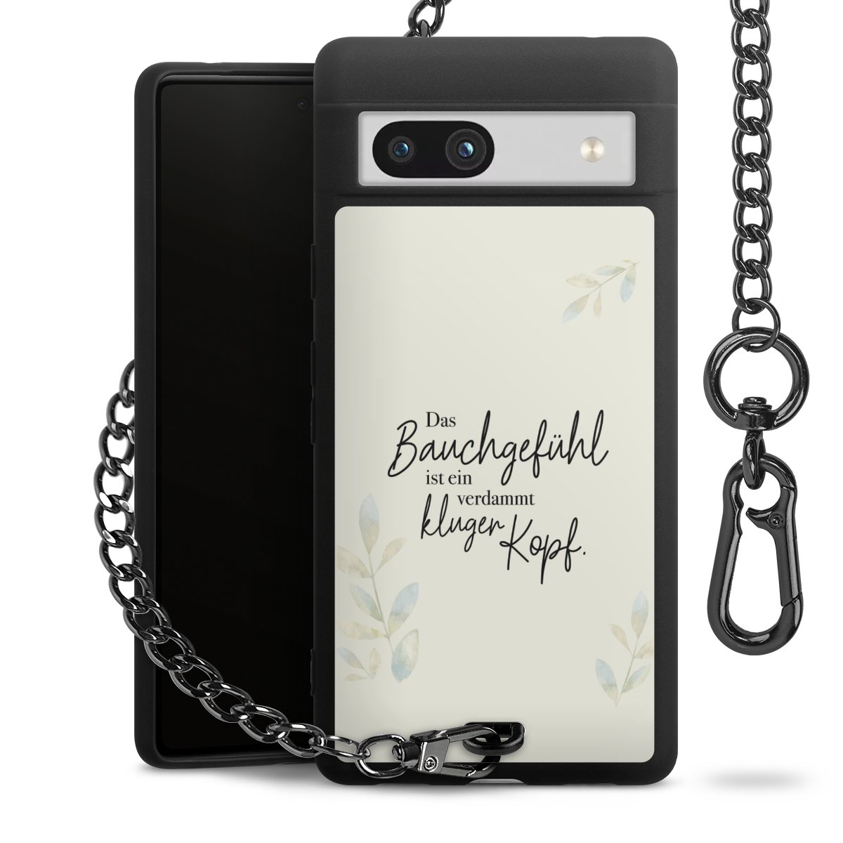 Die mattschwarze Silikon-Handyhülle besteht aus robustem TPU (thermoplastisches Polyurethan). Sie ist flexibel und schützt Dein Smartphone vor Stößen und Kratzern. Die Kette sowie der Karabinerhaken sind aus Metall in Gunmetal-Optik gefertigt. Für dieses Produkt kommen ausschließlich TÜV-geprüfte Materialien zum Einsatz.