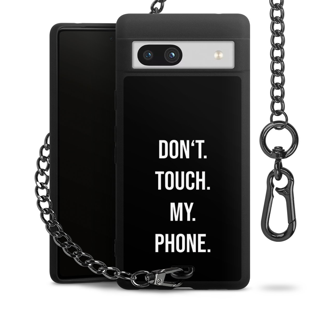 Die mattschwarze Silikon-Handyhülle besteht aus robustem TPU (thermoplastisches Polyurethan). Sie ist flexibel und schützt Dein Smartphone vor Stößen und Kratzern. Die Kette sowie der Karabinerhaken sind aus Metall in Gunmetal-Optik gefertigt. Für dieses Produkt kommen ausschließlich TÜV-geprüfte Materialien zum Einsatz.