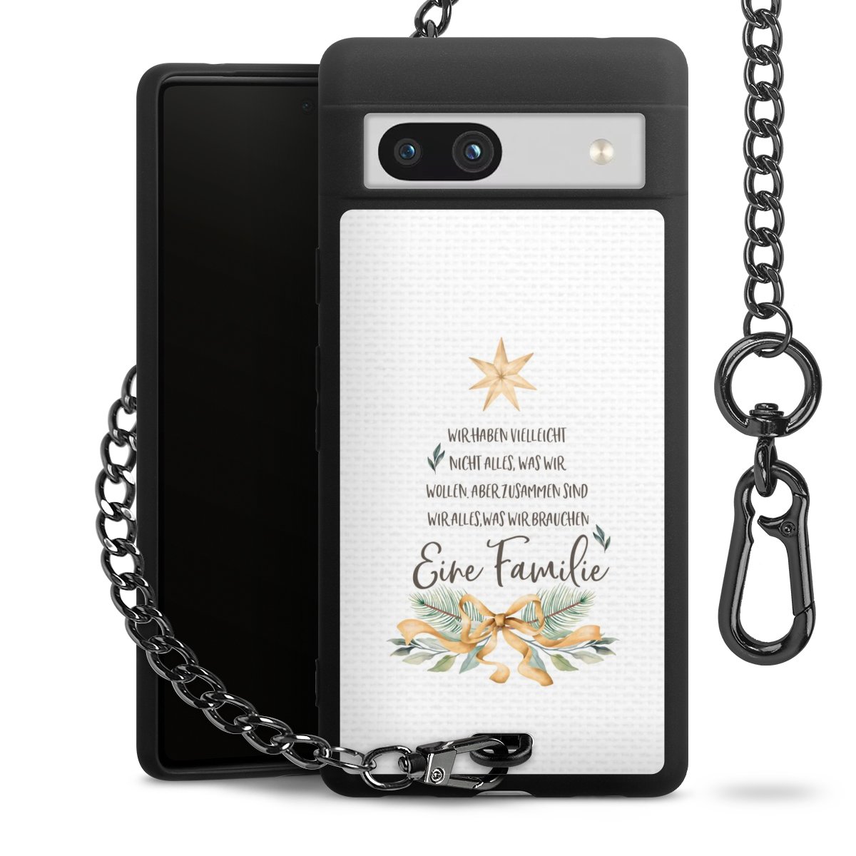 Die mattschwarze Silikon-Handyhülle besteht aus robustem TPU (thermoplastisches Polyurethan). Sie ist flexibel und schützt Dein Smartphone vor Stößen und Kratzern. Die Kette sowie der Karabinerhaken sind aus Metall in Gunmetal-Optik gefertigt. Für dieses Produkt kommen ausschließlich TÜV-geprüfte Materialien zum Einsatz.