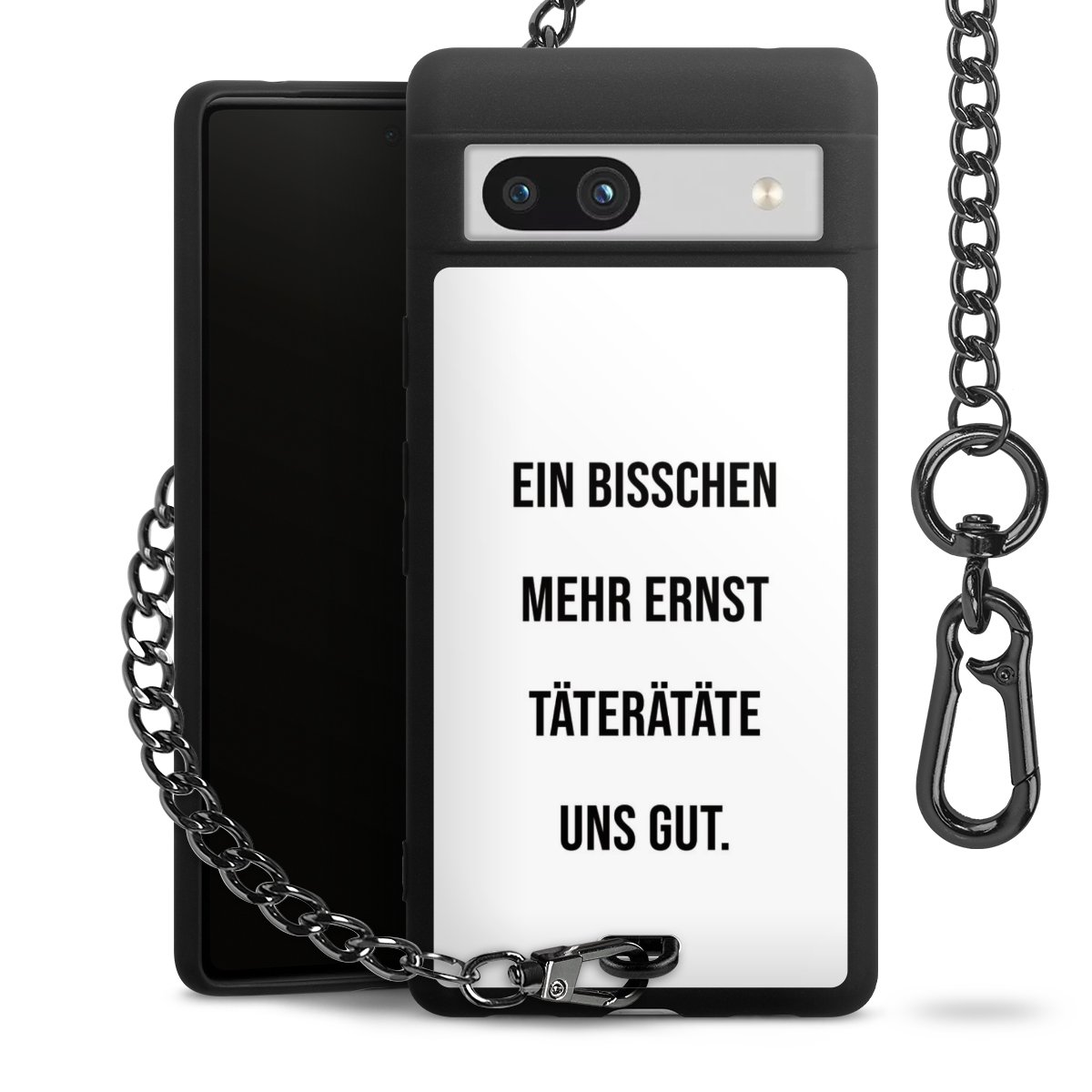 Die mattschwarze Silikon-Handyhülle besteht aus robustem TPU (thermoplastisches Polyurethan). Sie ist flexibel und schützt Dein Smartphone vor Stößen und Kratzern. Die Kette sowie der Karabinerhaken sind aus Metall in Gunmetal-Optik gefertigt. Für dieses Produkt kommen ausschließlich TÜV-geprüfte Materialien zum Einsatz.