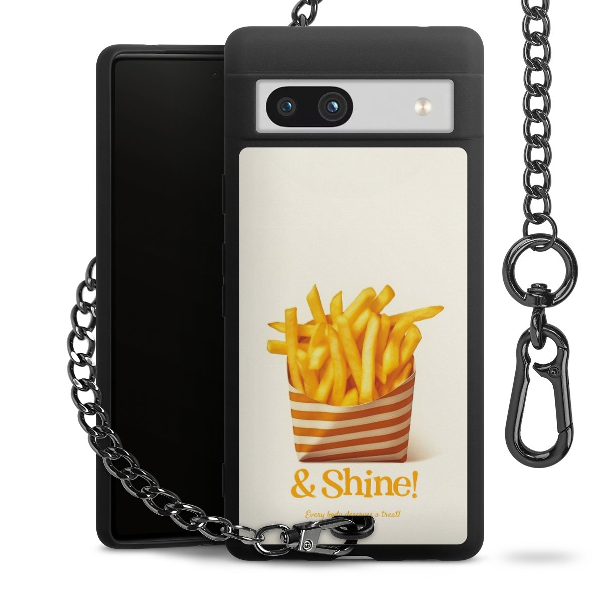 Die mattschwarze Silikon-Handyhülle besteht aus robustem TPU (thermoplastisches Polyurethan). Sie ist flexibel und schützt Dein Smartphone vor Stößen und Kratzern. Die Kette sowie der Karabinerhaken sind aus Metall in Gunmetal-Optik gefertigt. Für dieses Produkt kommen ausschließlich TÜV-geprüfte Materialien zum Einsatz.