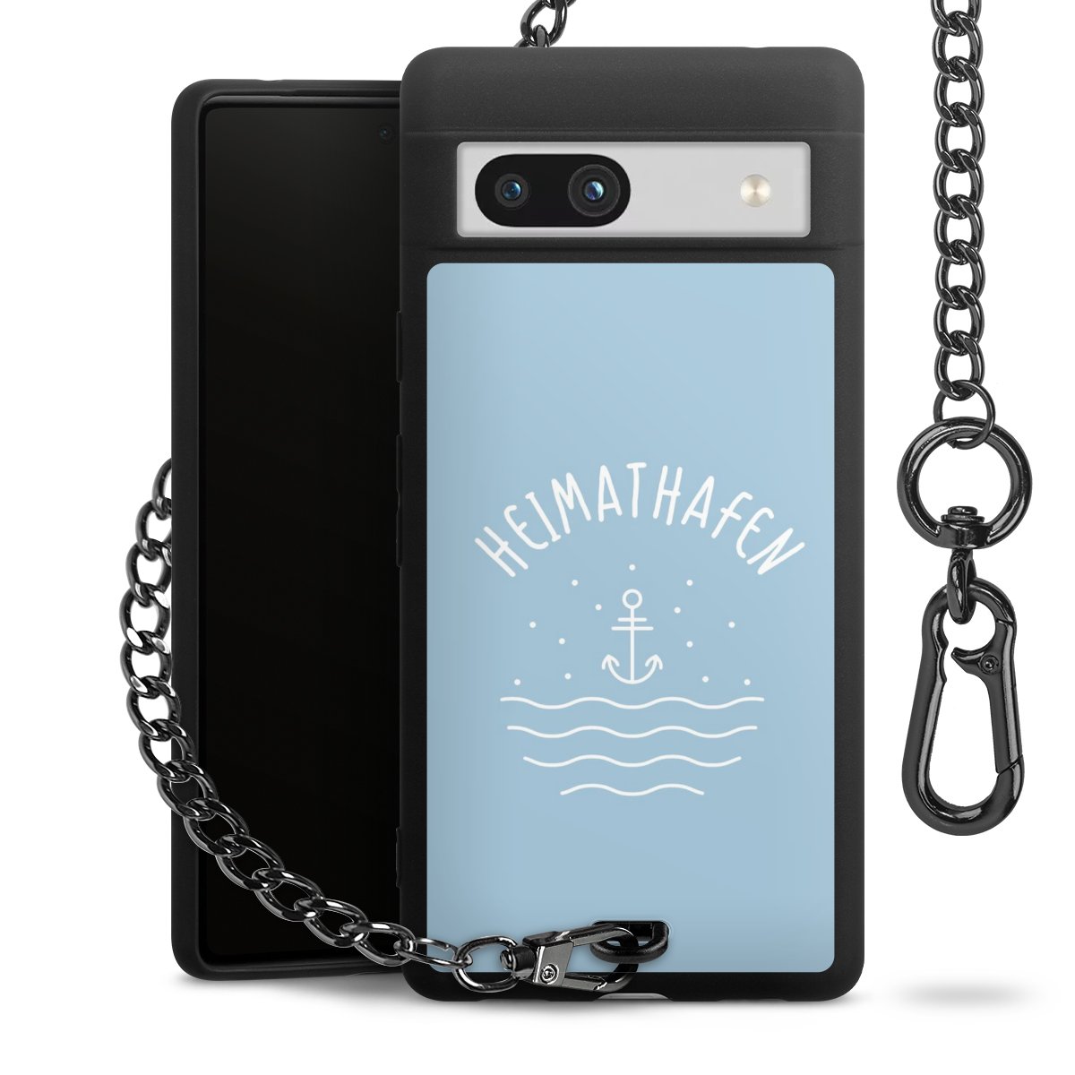 Die mattschwarze Silikon-Handyhülle besteht aus robustem TPU (thermoplastisches Polyurethan). Sie ist flexibel und schützt Dein Smartphone vor Stößen und Kratzern. Die Kette sowie der Karabinerhaken sind aus Metall in Gunmetal-Optik gefertigt. Für dieses Produkt kommen ausschließlich TÜV-geprüfte Materialien zum Einsatz.