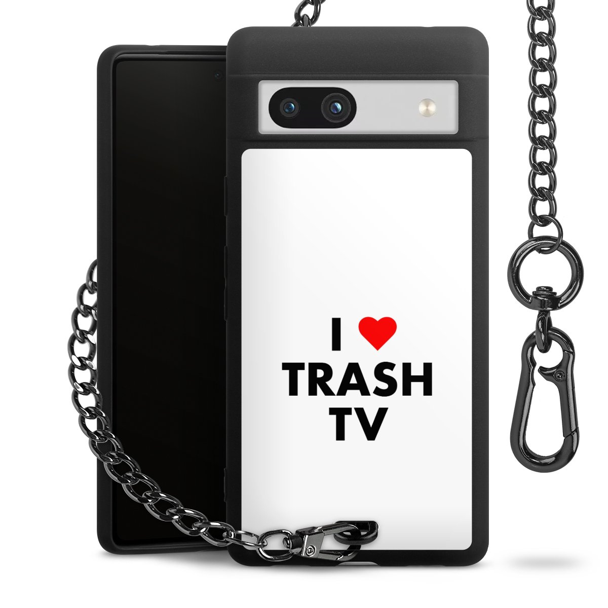 Die mattschwarze Silikon-Handyhülle besteht aus robustem TPU (thermoplastisches Polyurethan). Sie ist flexibel und schützt Dein Smartphone vor Stößen und Kratzern. Die Kette sowie der Karabinerhaken sind aus Metall in Gunmetal-Optik gefertigt. Für dieses Produkt kommen ausschließlich TÜV-geprüfte Materialien zum Einsatz.