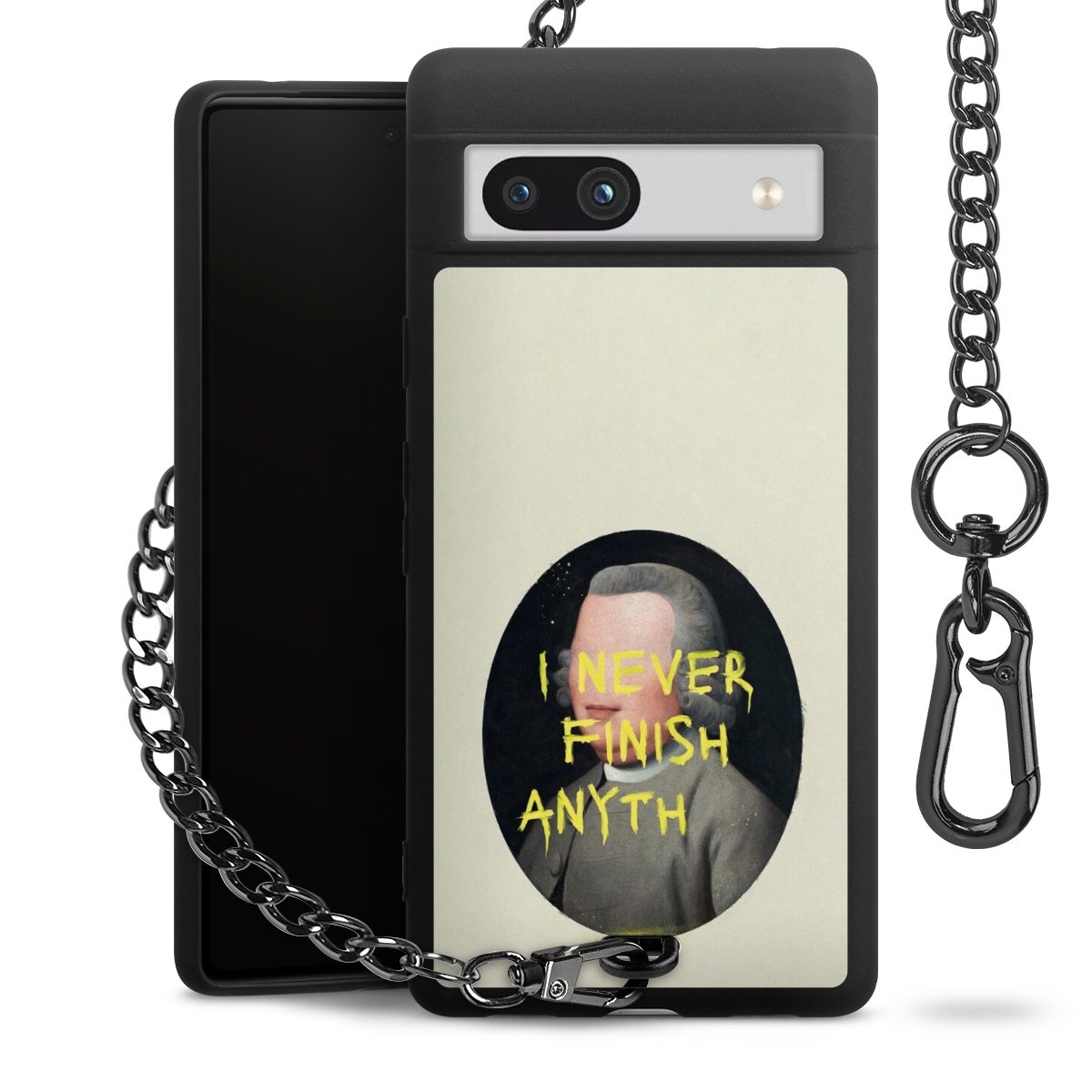 Die mattschwarze Silikon-Handyhülle besteht aus robustem TPU (thermoplastisches Polyurethan). Sie ist flexibel und schützt Dein Smartphone vor Stößen und Kratzern. Die Kette sowie der Karabinerhaken sind aus Metall in Gunmetal-Optik gefertigt. Für dieses Produkt kommen ausschließlich TÜV-geprüfte Materialien zum Einsatz.