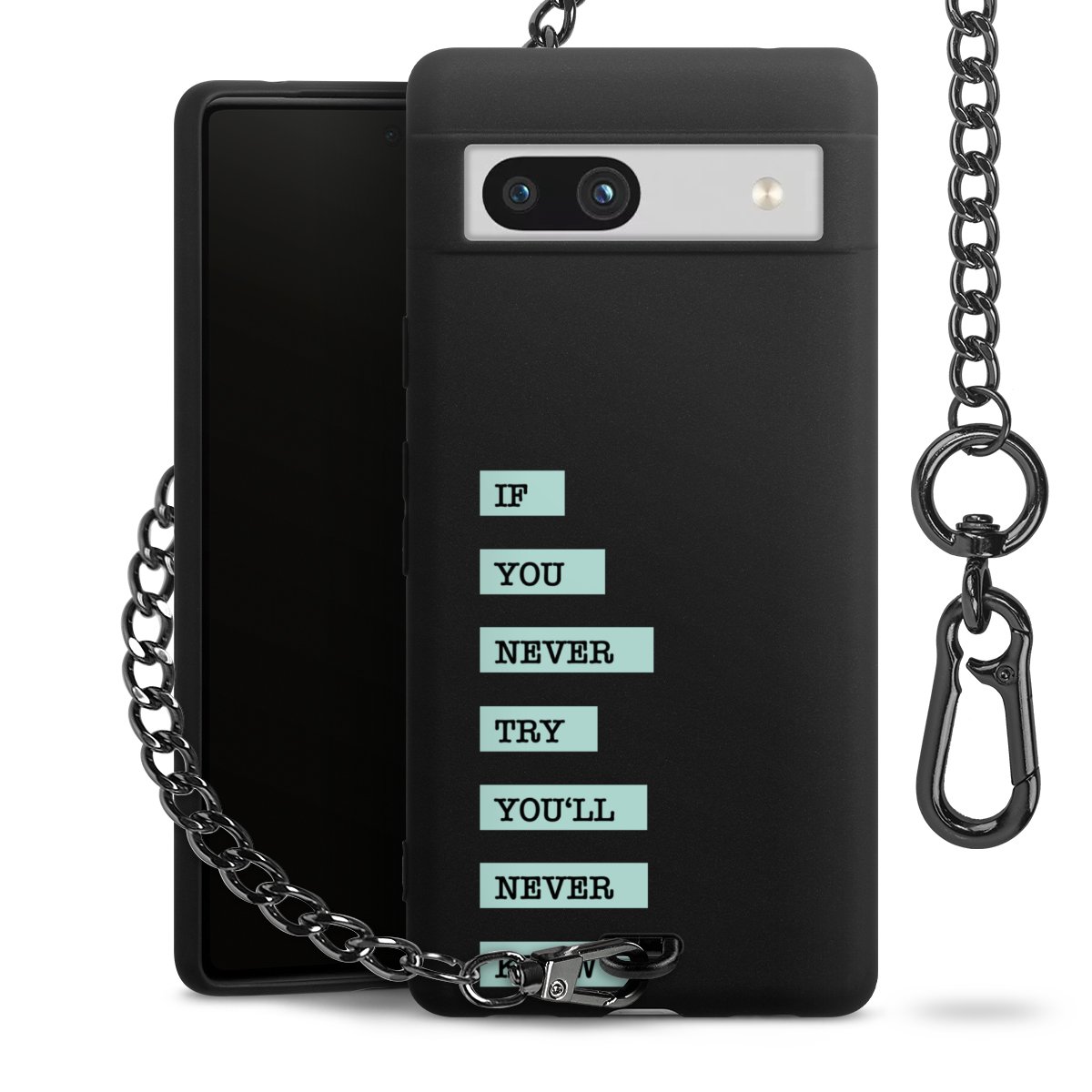 Die mattschwarze Silikon-Handyhülle besteht aus robustem TPU (thermoplastisches Polyurethan). Sie ist flexibel und schützt Dein Smartphone vor Stößen und Kratzern. Die Kette sowie der Karabinerhaken sind aus Metall in Gunmetal-Optik gefertigt. Für dieses Produkt kommen ausschließlich TÜV-geprüfte Materialien zum Einsatz.