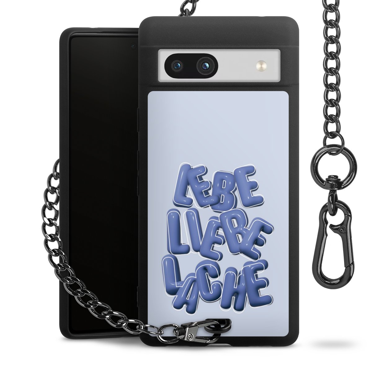 Die mattschwarze Silikon-Handyhülle besteht aus robustem TPU (thermoplastisches Polyurethan). Sie ist flexibel und schützt Dein Smartphone vor Stößen und Kratzern. Die Kette sowie der Karabinerhaken sind aus Metall in Gunmetal-Optik gefertigt. Für dieses Produkt kommen ausschließlich TÜV-geprüfte Materialien zum Einsatz.