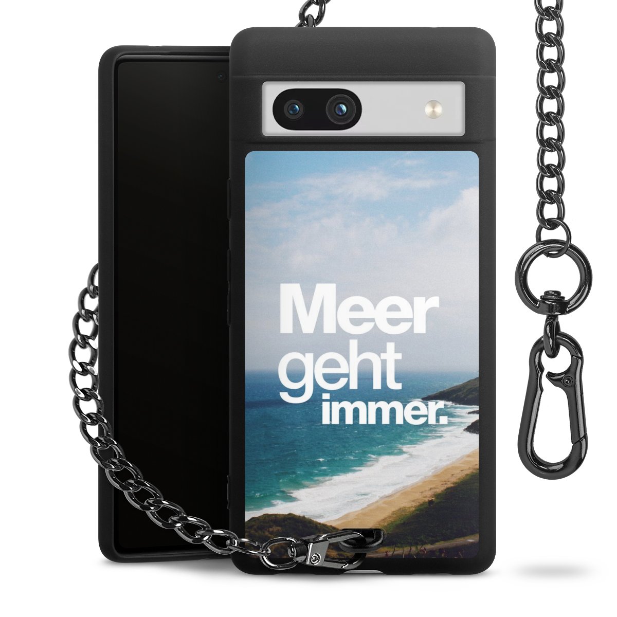 Die mattschwarze Silikon-Handyhülle besteht aus robustem TPU (thermoplastisches Polyurethan). Sie ist flexibel und schützt Dein Smartphone vor Stößen und Kratzern. Die Kette sowie der Karabinerhaken sind aus Metall in Gunmetal-Optik gefertigt. Für dieses Produkt kommen ausschließlich TÜV-geprüfte Materialien zum Einsatz.