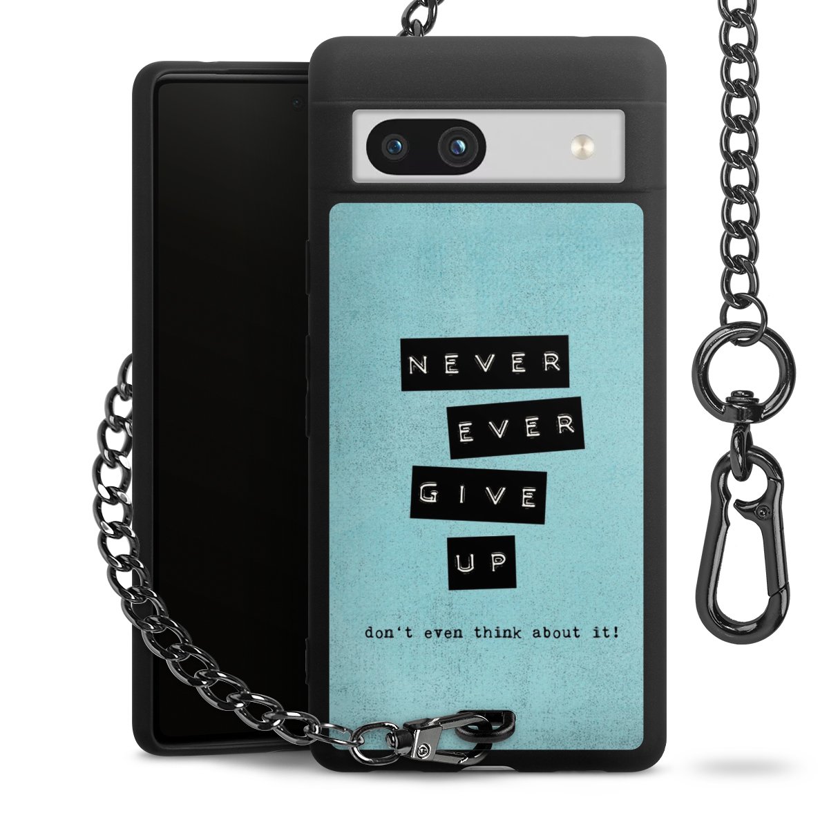 Die mattschwarze Silikon-Handyhülle besteht aus robustem TPU (thermoplastisches Polyurethan). Sie ist flexibel und schützt Dein Smartphone vor Stößen und Kratzern. Die Kette sowie der Karabinerhaken sind aus Metall in Gunmetal-Optik gefertigt. Für dieses Produkt kommen ausschließlich TÜV-geprüfte Materialien zum Einsatz.
