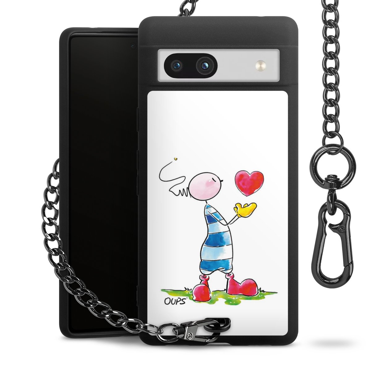 Die mattschwarze Silikon-Handyhülle besteht aus robustem TPU (thermoplastisches Polyurethan). Sie ist flexibel und schützt Dein Smartphone vor Stößen und Kratzern. Die Kette sowie der Karabinerhaken sind aus Metall in Gunmetal-Optik gefertigt. Für dieses Produkt kommen ausschließlich TÜV-geprüfte Materialien zum Einsatz.