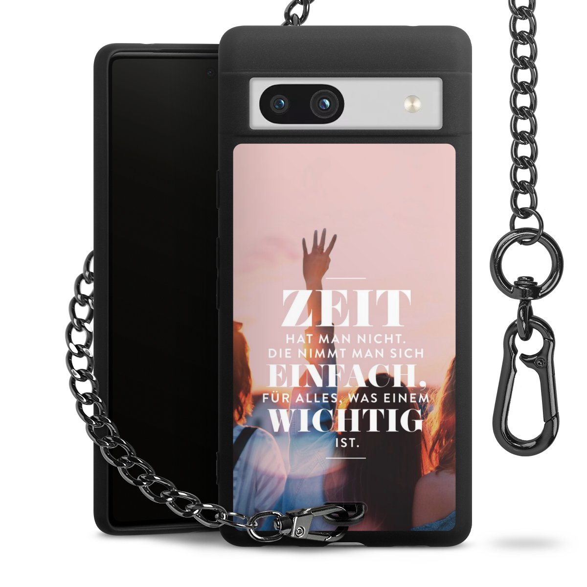 Die mattschwarze Silikon-Handyhülle besteht aus robustem TPU (thermoplastisches Polyurethan). Sie ist flexibel und schützt Dein Smartphone vor Stößen und Kratzern. Die Kette sowie der Karabinerhaken sind aus Metall in Gunmetal-Optik gefertigt. Für dieses Produkt kommen ausschließlich TÜV-geprüfte Materialien zum Einsatz.