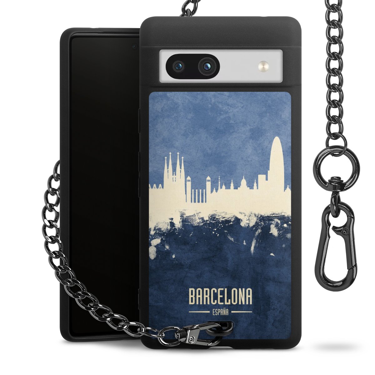 Die mattschwarze Silikon-Handyhülle besteht aus robustem TPU (thermoplastisches Polyurethan). Sie ist flexibel und schützt Dein Smartphone vor Stößen und Kratzern. Die Kette sowie der Karabinerhaken sind aus Metall in Gunmetal-Optik gefertigt. Für dieses Produkt kommen ausschließlich TÜV-geprüfte Materialien zum Einsatz.