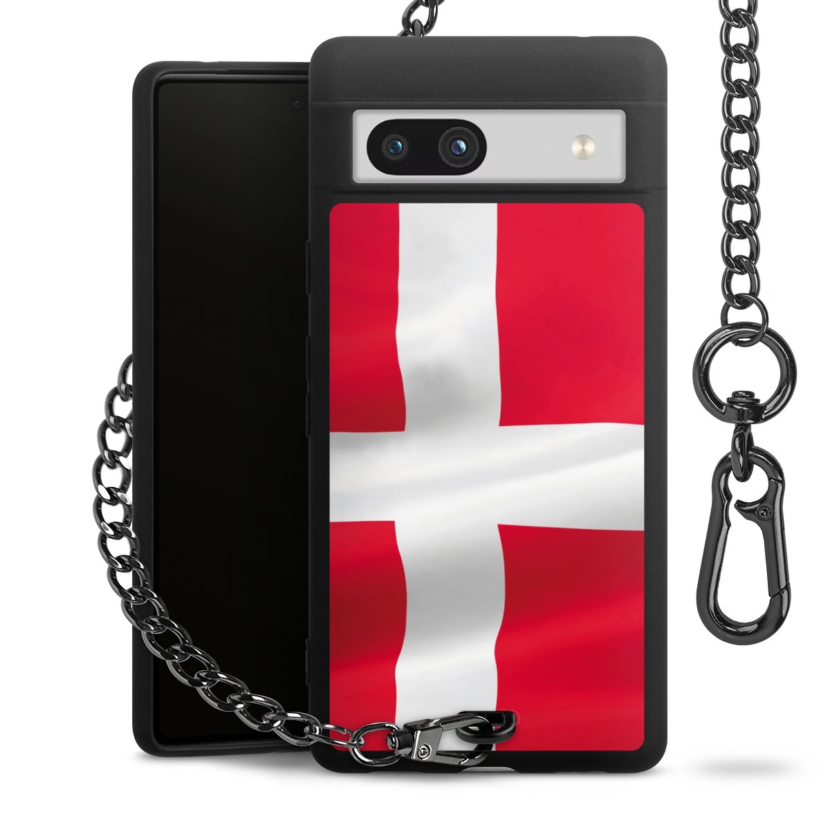 Die mattschwarze Silikon-Handyhülle besteht aus robustem TPU (thermoplastisches Polyurethan). Sie ist flexibel und schützt Dein Smartphone vor Stößen und Kratzern. Die Kette sowie der Karabinerhaken sind aus Metall in Gunmetal-Optik gefertigt. Für dieses Produkt kommen ausschließlich TÜV-geprüfte Materialien zum Einsatz.