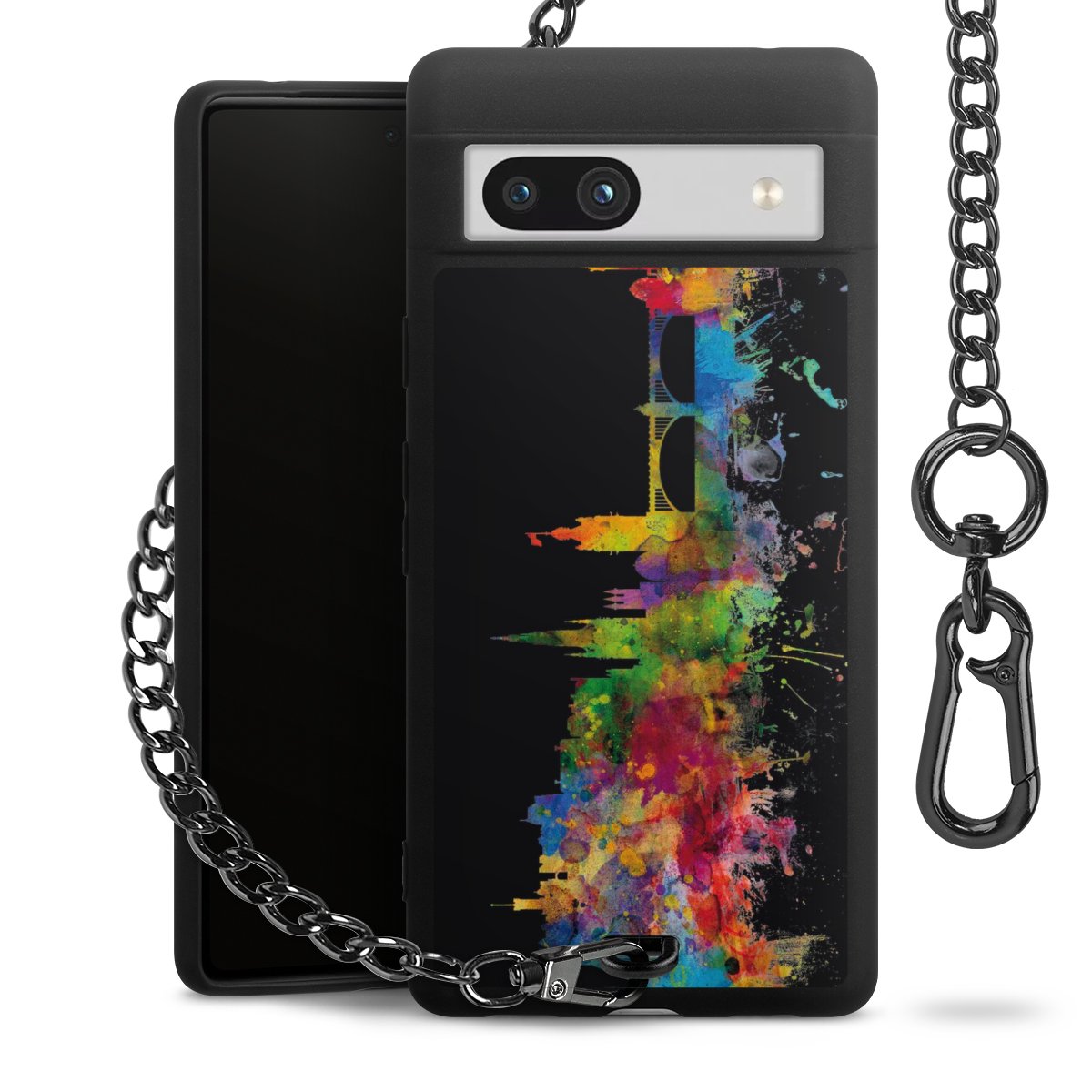 Die mattschwarze Silikon-Handyhülle besteht aus robustem TPU (thermoplastisches Polyurethan). Sie ist flexibel und schützt Dein Smartphone vor Stößen und Kratzern. Die Kette sowie der Karabinerhaken sind aus Metall in Gunmetal-Optik gefertigt. Für dieses Produkt kommen ausschließlich TÜV-geprüfte Materialien zum Einsatz.