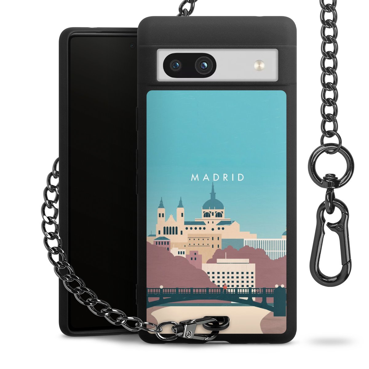 Die mattschwarze Silikon-Handyhülle besteht aus robustem TPU (thermoplastisches Polyurethan). Sie ist flexibel und schützt Dein Smartphone vor Stößen und Kratzern. Die Kette sowie der Karabinerhaken sind aus Metall in Gunmetal-Optik gefertigt. Für dieses Produkt kommen ausschließlich TÜV-geprüfte Materialien zum Einsatz.