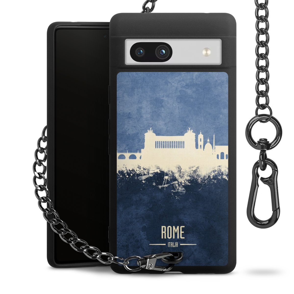 Die mattschwarze Silikon-Handyhülle besteht aus robustem TPU (thermoplastisches Polyurethan). Sie ist flexibel und schützt Dein Smartphone vor Stößen und Kratzern. Die Kette sowie der Karabinerhaken sind aus Metall in Gunmetal-Optik gefertigt. Für dieses Produkt kommen ausschließlich TÜV-geprüfte Materialien zum Einsatz.