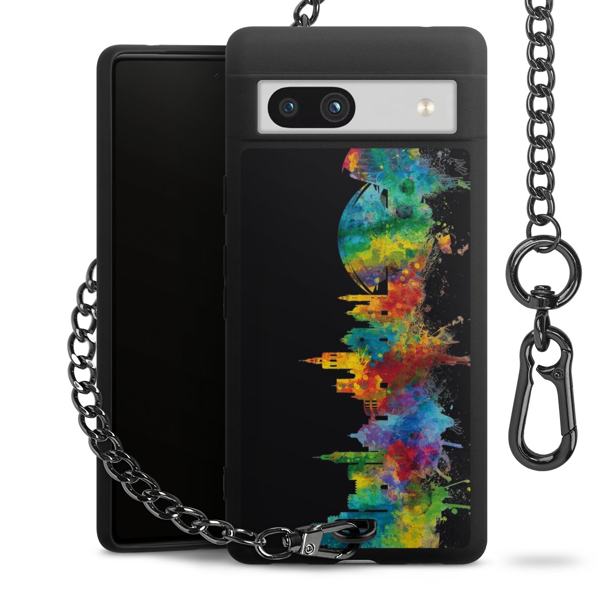 Die mattschwarze Silikon-Handyhülle besteht aus robustem TPU (thermoplastisches Polyurethan). Sie ist flexibel und schützt Dein Smartphone vor Stößen und Kratzern. Die Kette sowie der Karabinerhaken sind aus Metall in Gunmetal-Optik gefertigt. Für dieses Produkt kommen ausschließlich TÜV-geprüfte Materialien zum Einsatz.