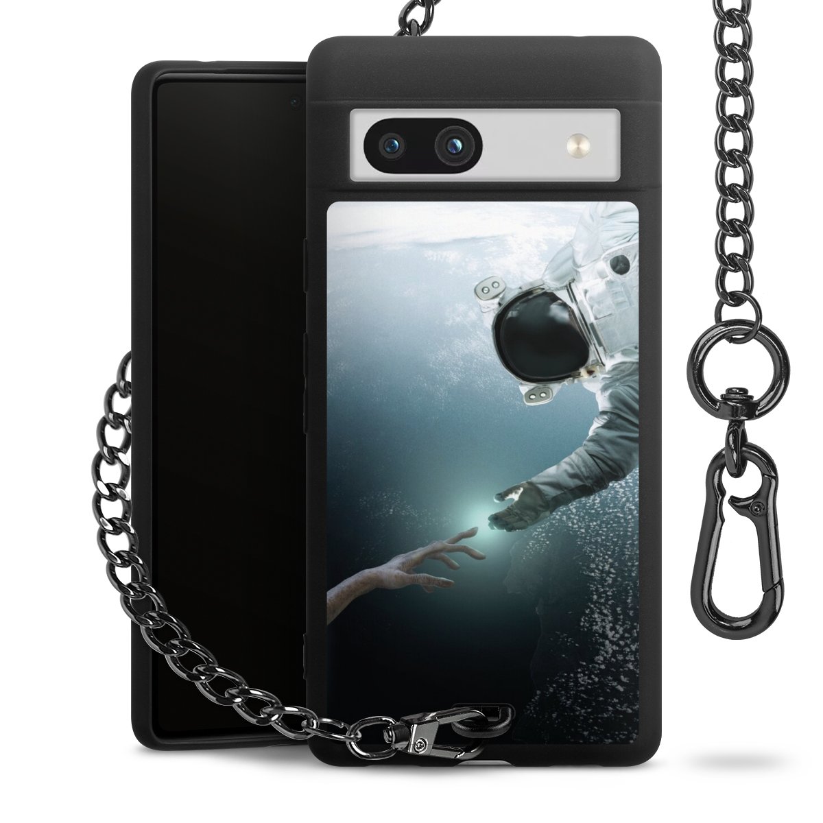 Die mattschwarze Silikon-Handyhülle besteht aus robustem TPU (thermoplastisches Polyurethan). Sie ist flexibel und schützt Dein Smartphone vor Stößen und Kratzern. Die Kette sowie der Karabinerhaken sind aus Metall in Gunmetal-Optik gefertigt. Für dieses Produkt kommen ausschließlich TÜV-geprüfte Materialien zum Einsatz.