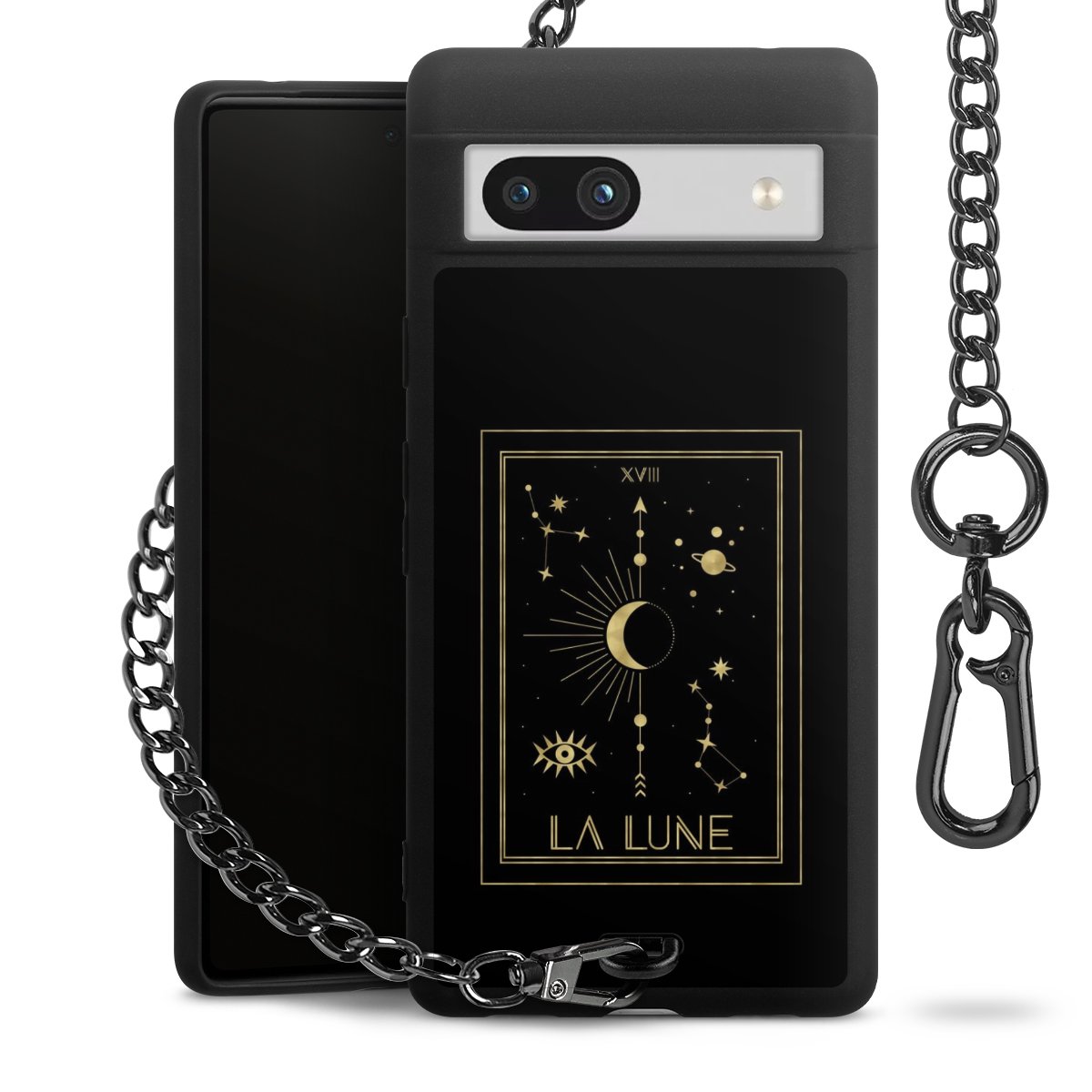 Die mattschwarze Silikon-Handyhülle besteht aus robustem TPU (thermoplastisches Polyurethan). Sie ist flexibel und schützt Dein Smartphone vor Stößen und Kratzern. Die Kette sowie der Karabinerhaken sind aus Metall in Gunmetal-Optik gefertigt. Für dieses Produkt kommen ausschließlich TÜV-geprüfte Materialien zum Einsatz.